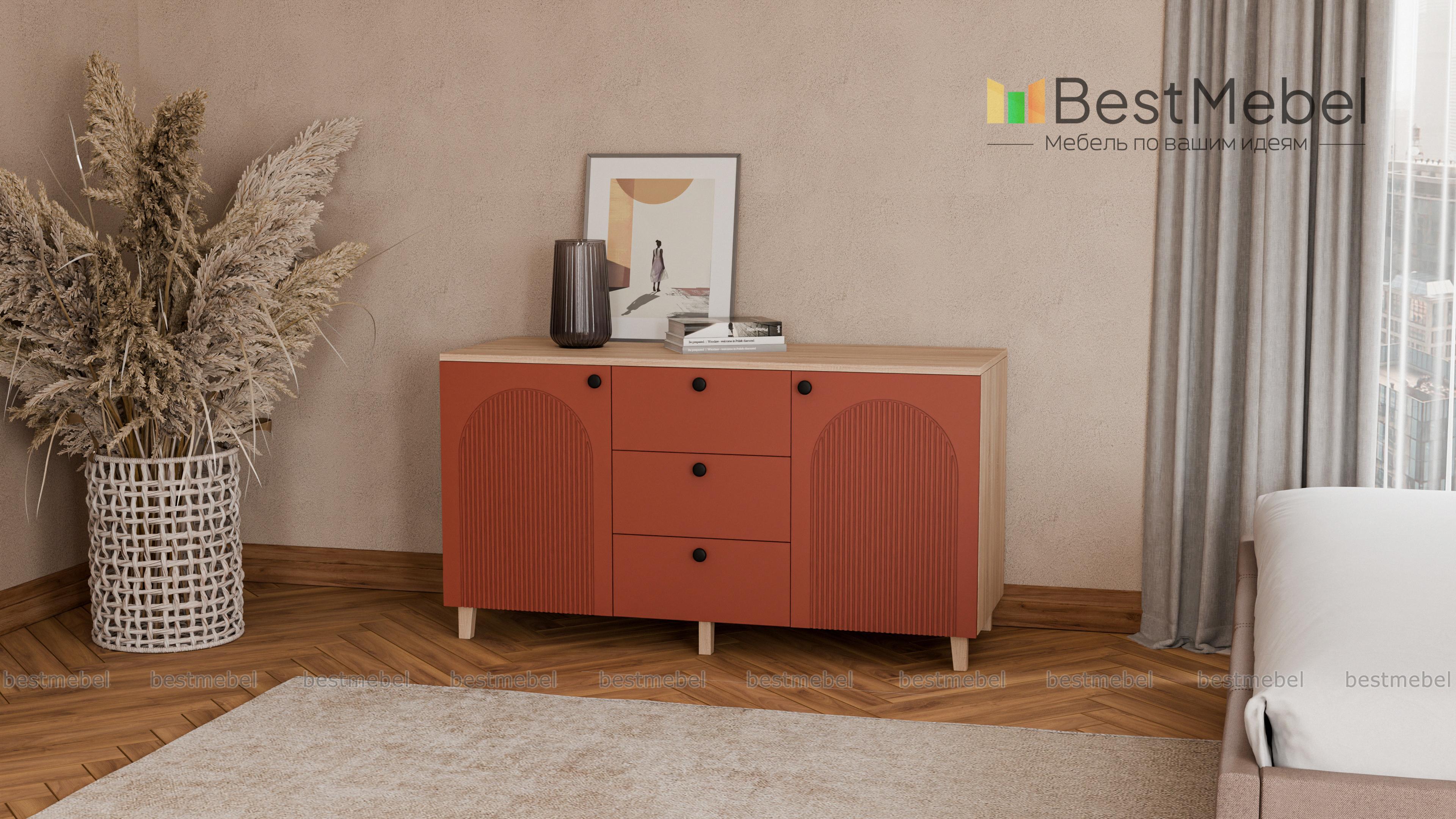 Комод Рене 1 BMS поможет сохранить порядок в комнате и добавит в интерьер стильные акценты. Под широкой столешницей, на которой эффектно смотрится декор, располагаются два распашных отделения с полками и ряд из трех вместительных выдвижных ящиков. В современном дизайне комода использована комбинация темного фактурного фасада и корпуса под древесный массив. Купить комод Рене 1 BMS приглашаем в наш интернет-магазин, подобрав размеры и цвет по своему вкусу.