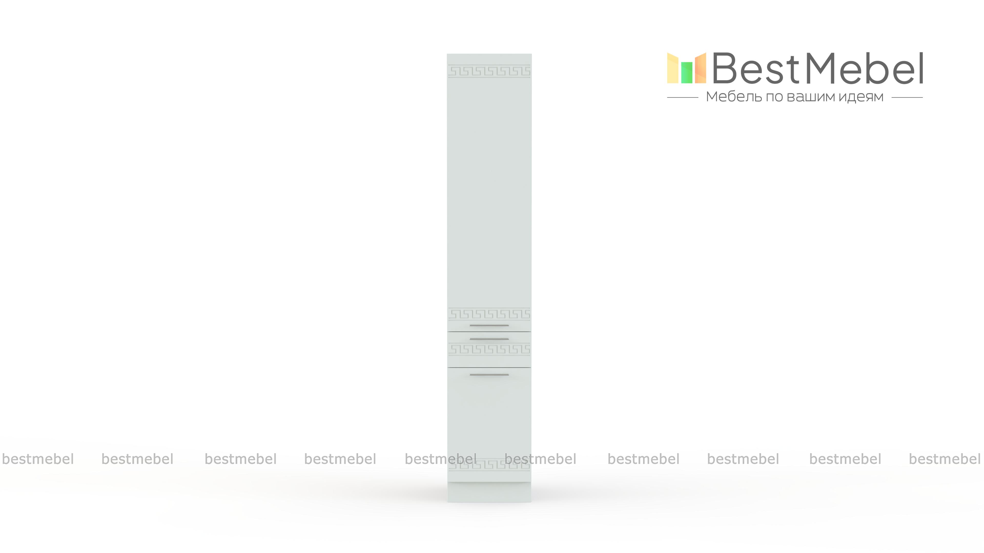 Шкаф-пенал 1 ящик 400 Греция BMS – это компактные размеры, отличная вместительность и демократичная цена. Высокий узкий шкаф оборудован двумя распашными отделениями с полками для продуктов и кухонной утвари и выдвижным ящиком, удобным для мелких вещей. Фасады в белом матовом оттенке с орнаментом не только эффектно смотрятся, но и надолго сохранят эстетичный вид благодаря износостойким материалам. Купить шкаф-пенал 1 ящик 400 Греция BMS, простой в уходе и надежный в эксплуатации, приглашаем недорого в наш интернет-магазин.