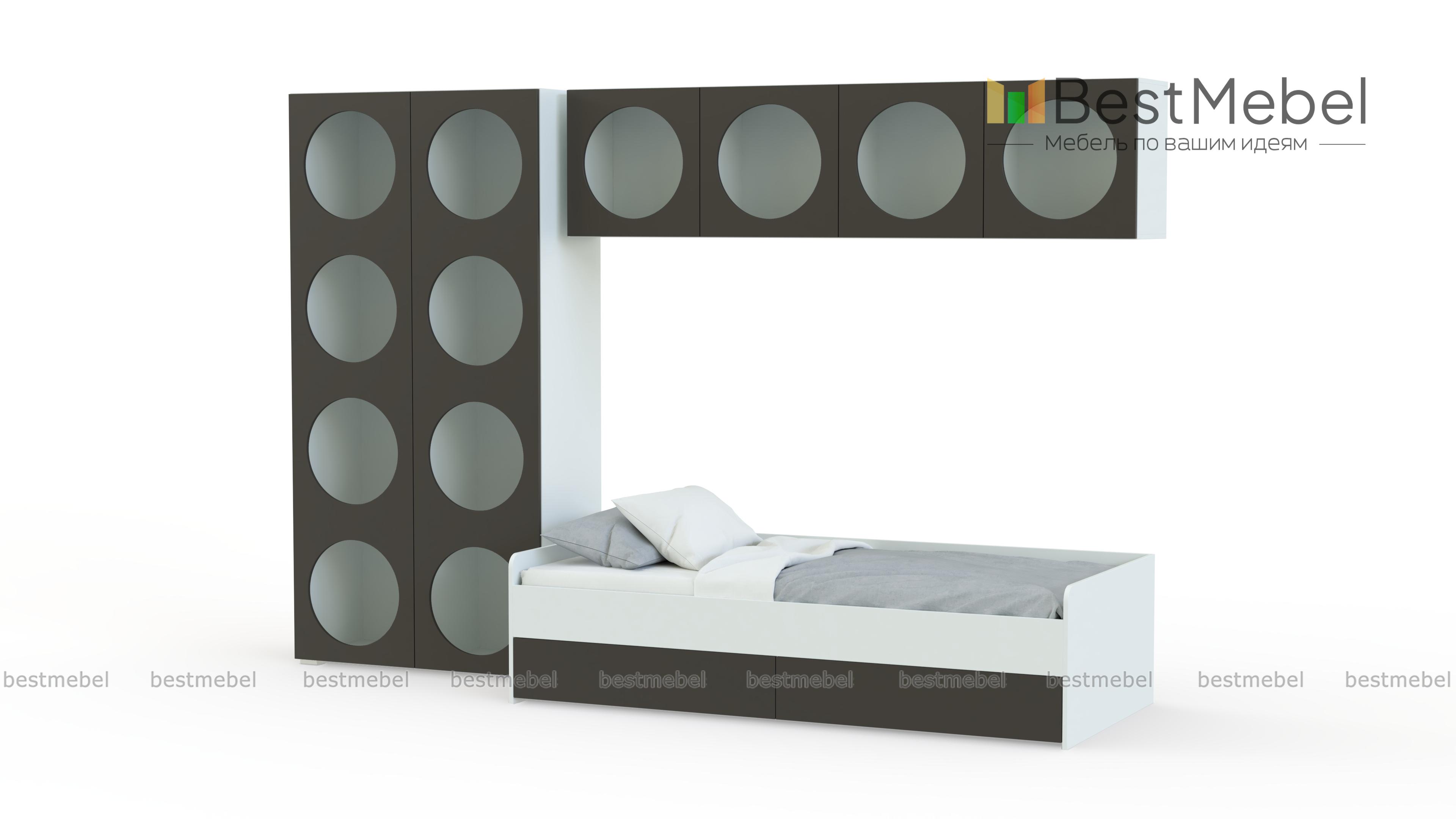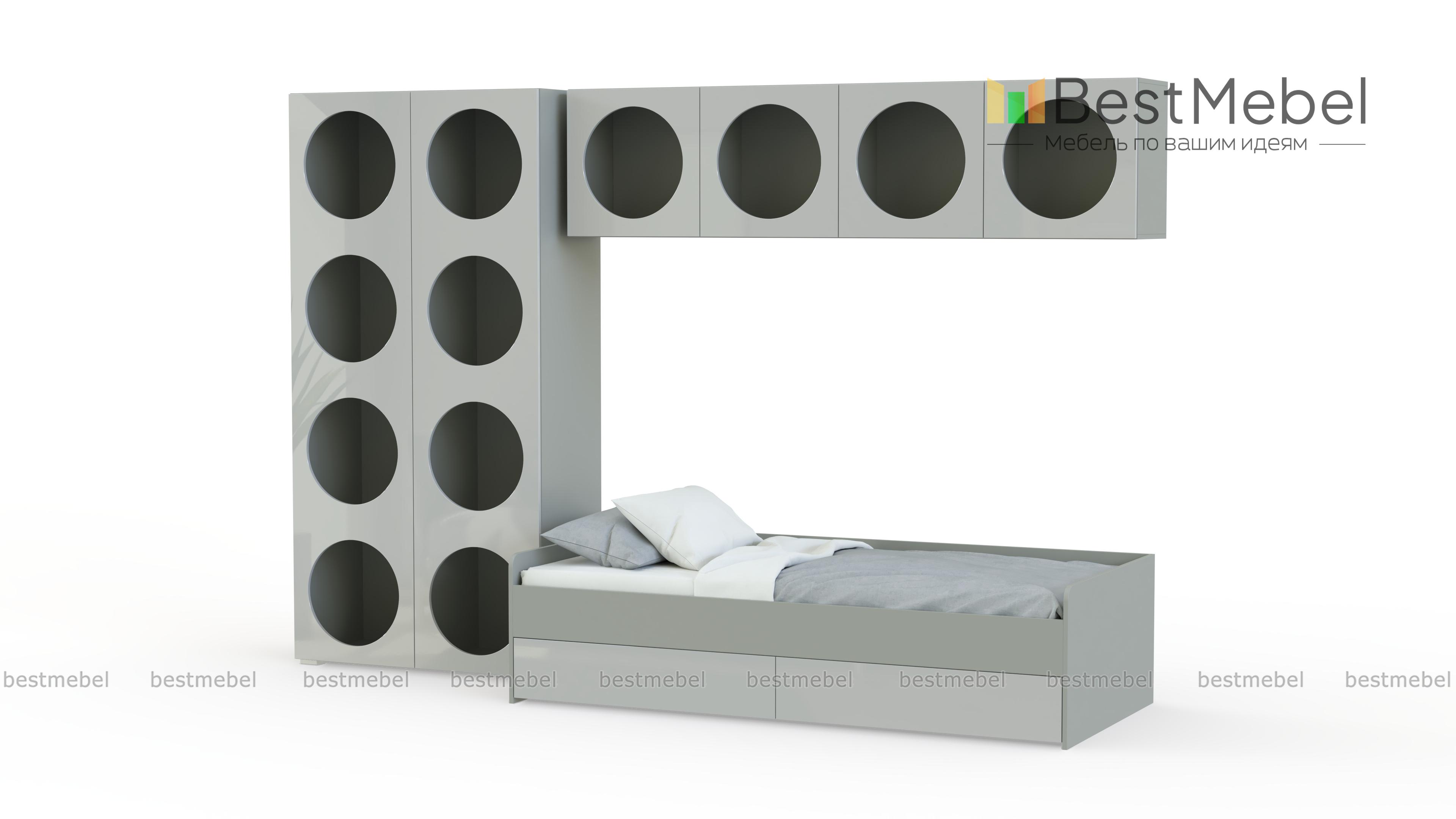 Детская комната Авелин 4 BMS с необычной геометрией и трендовыми оттенками создана специально для современных подростков. Свободно расположить на виду любимые гаджеты, игрушки и книги поможет большое количество открытых круглых полок. Выделенную с помощью шкафа и подвесных полок зону отдыха занимает практичная кровать с парой бельевых ящиков. Купить детскую комнату Авелин 4 BMS вы всегда сможете в нашем интернет-магазине, по желанию изменив цвета и размеры.
