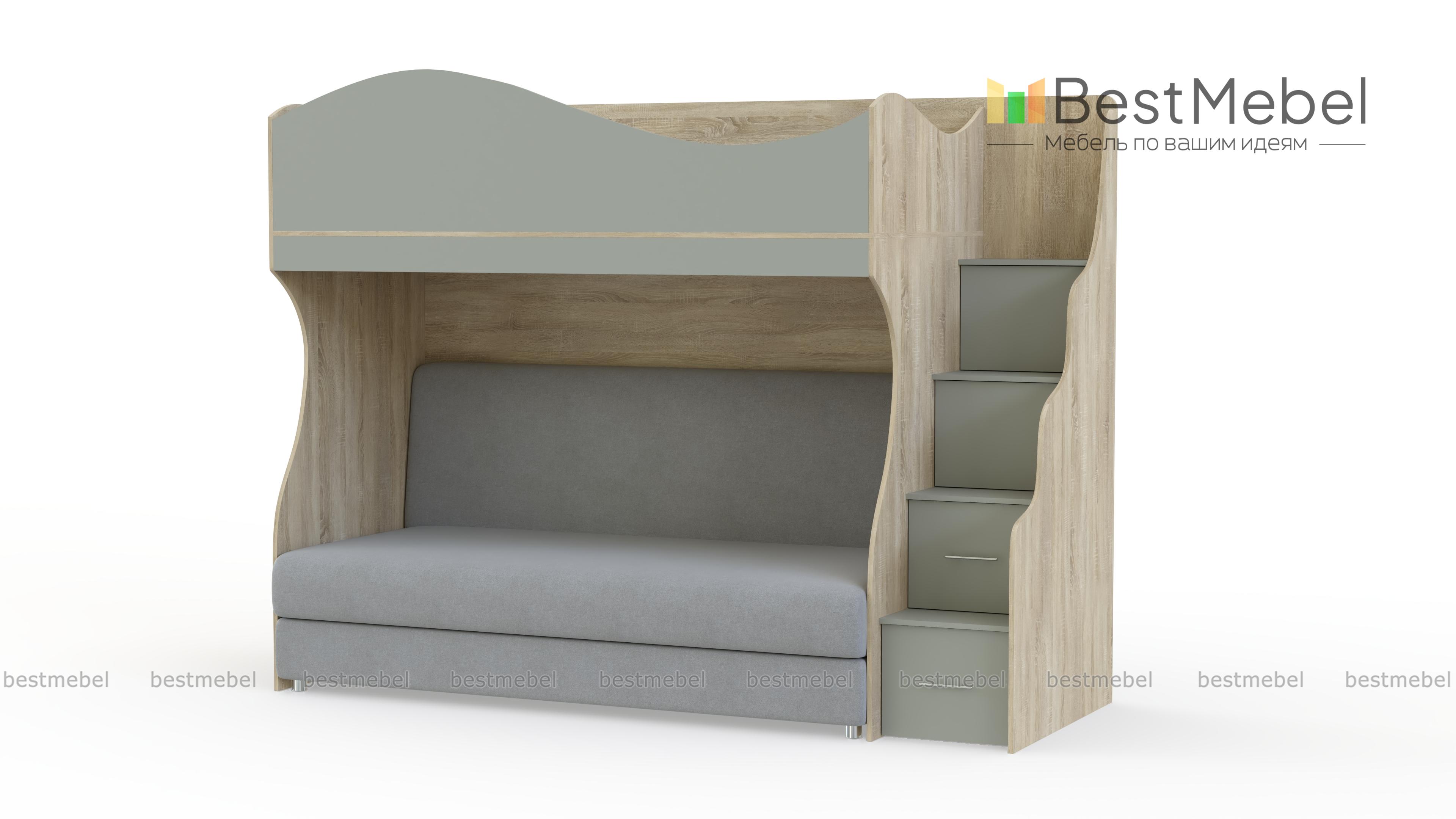 Детская кровать с диваном Дон Кихот 15 BMS объединила в стильной композиции комфортную зону отдыха и систему хранения. На втором ярусе располагается спальное место с фигурным бортиком, а в нише на первом – удобный двухместный диванчик. Легко забраться на второй ярус и разместить игрушки или книги поможет ребенку лестница-комод. В оформлении скомбинированы корпус практичного светлого оттенка и нейтральный древесный фасад. Купить детскую кровать с диваном Дон Кихот 15 BMS приглашаем в наш интернет-магазин.