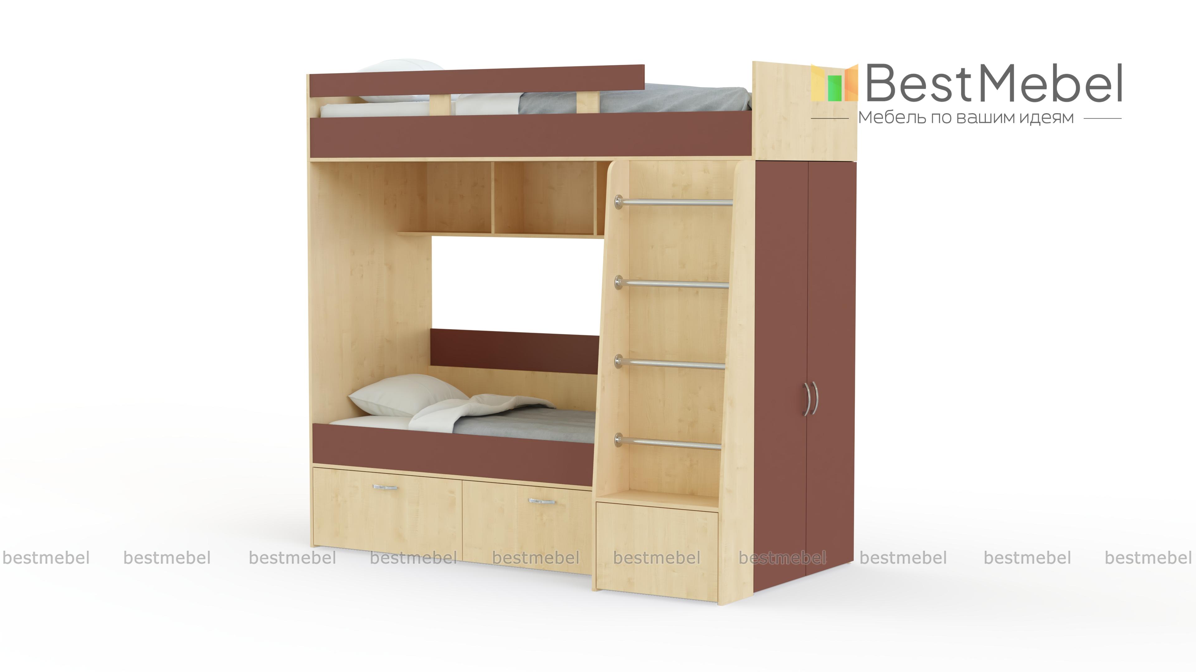 Двухъярусная кровать Белла 6 со шкафом BMS – недорогой современный комплект, который подарит малышам полноценный здоровый сон. Спальное место второго яруса ограждено защитным бортиком, вниз ведет удобная устойчивая лестница. Для хранения предметов гардероба предусмотрен встроенный шкаф, а игрушки и книги смогут расположиться на открытых полках между ярусами и за спинкой кровати. Купить двухъярусную кровать Белла 6 со шкафом BMS в подходящей расцветке вы сможете в нашем интернет-магазине.