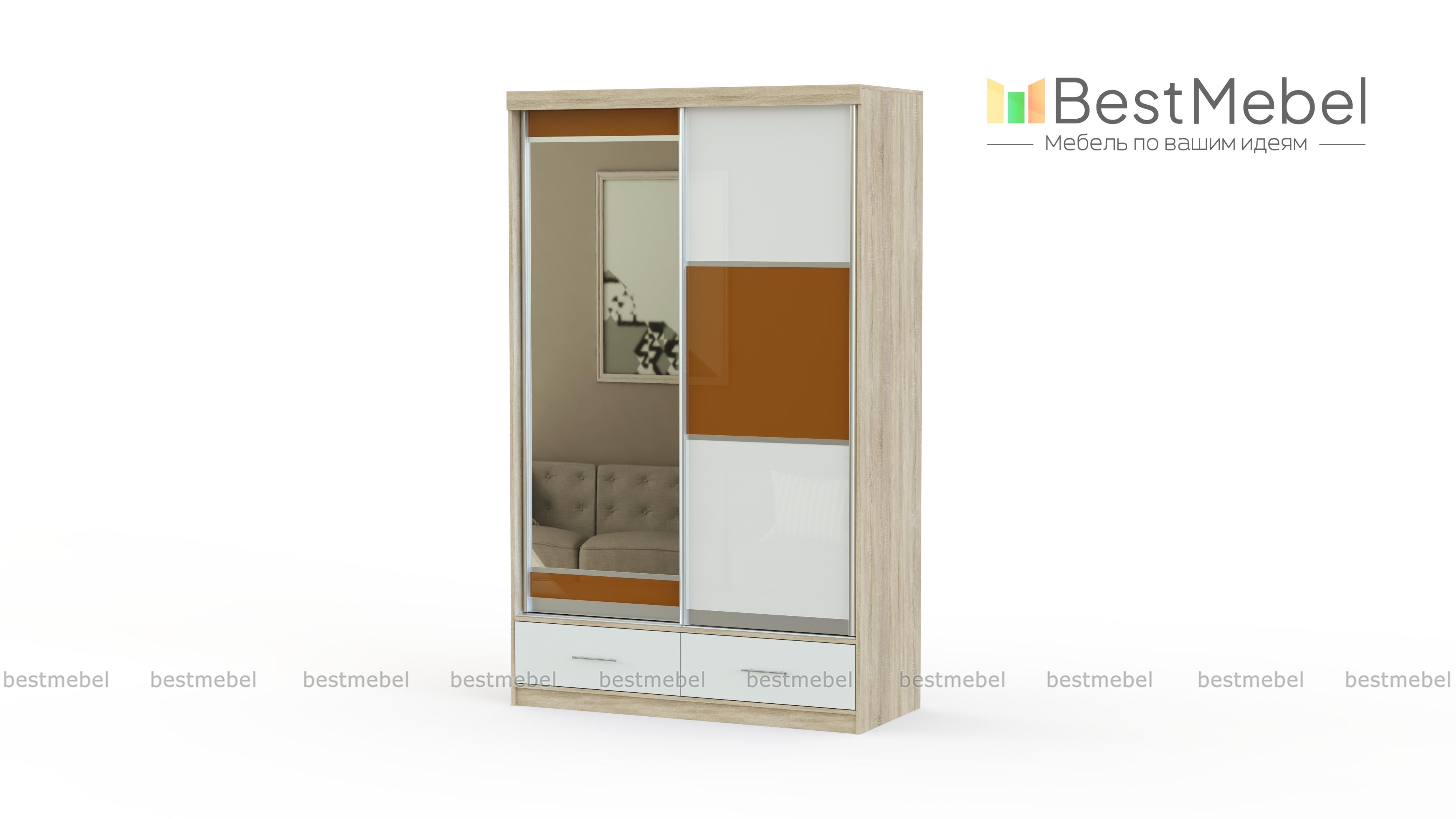 Внутреннее наполнение шкафа-купе – это 5 просторных ниш для Вашей одежды и обуви, 2 выдвижных ящика для мелочей, а также большое отделение со штангой для вешалок. Мы предлагаем варианты цветового оформления, доступные цены и услугу доставки, удобным для Вас способом.