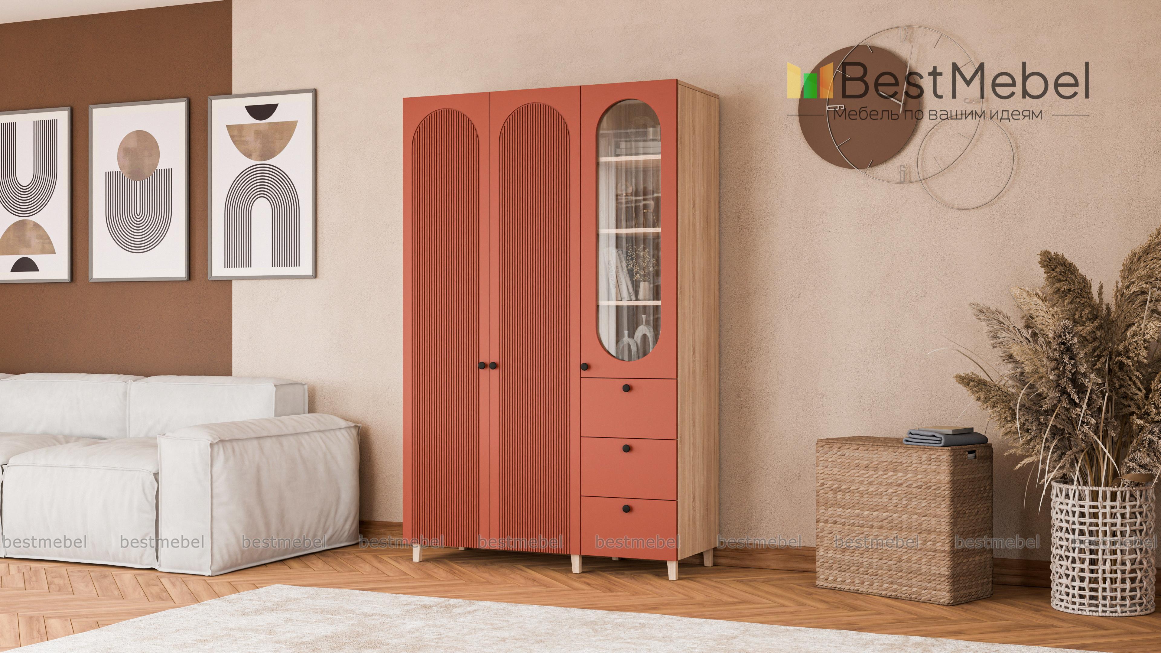 Шкаф распашной Рене 13 BMS объединил для хранения платяное отделение с двумя дверцами и витрину, комбинированную с тремя выдвижными ящиками. Одежда на вешалках, трикотаж, органайзеры с мелочами, книги и декор размещаются компактно и эстетично. Сочетание темных и природных древесных оттенков с декоративными вырезами и фрезеровкой — стильное современное решение. Купить шкаф распашной Рене 13 BMS вы всегда сможете в нашем интернет-магазине с изготовлением по индивидуальным размерам.