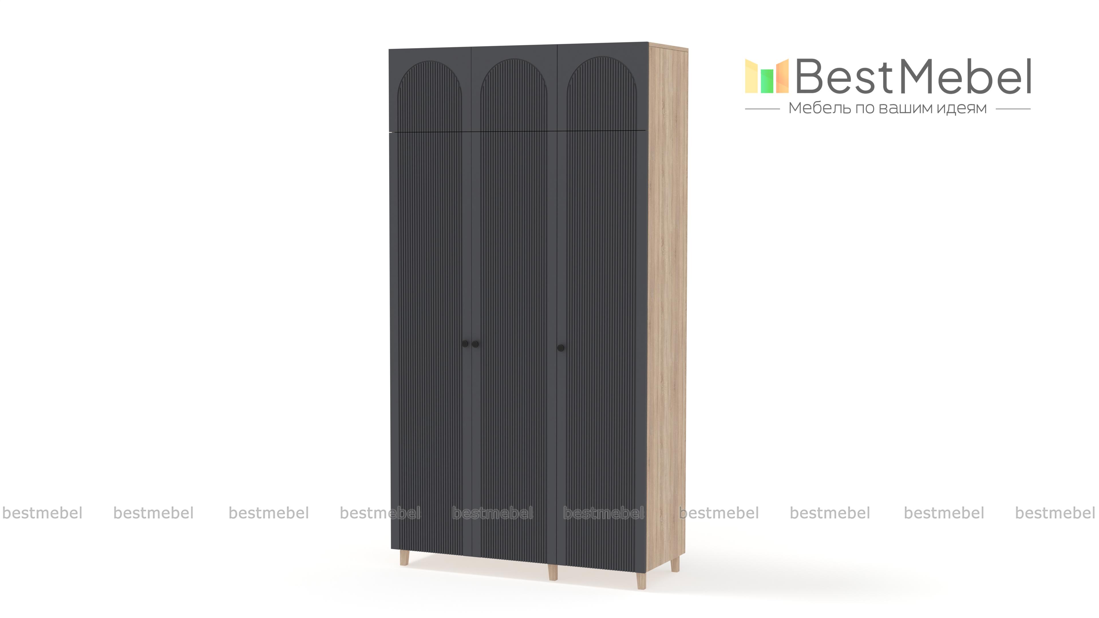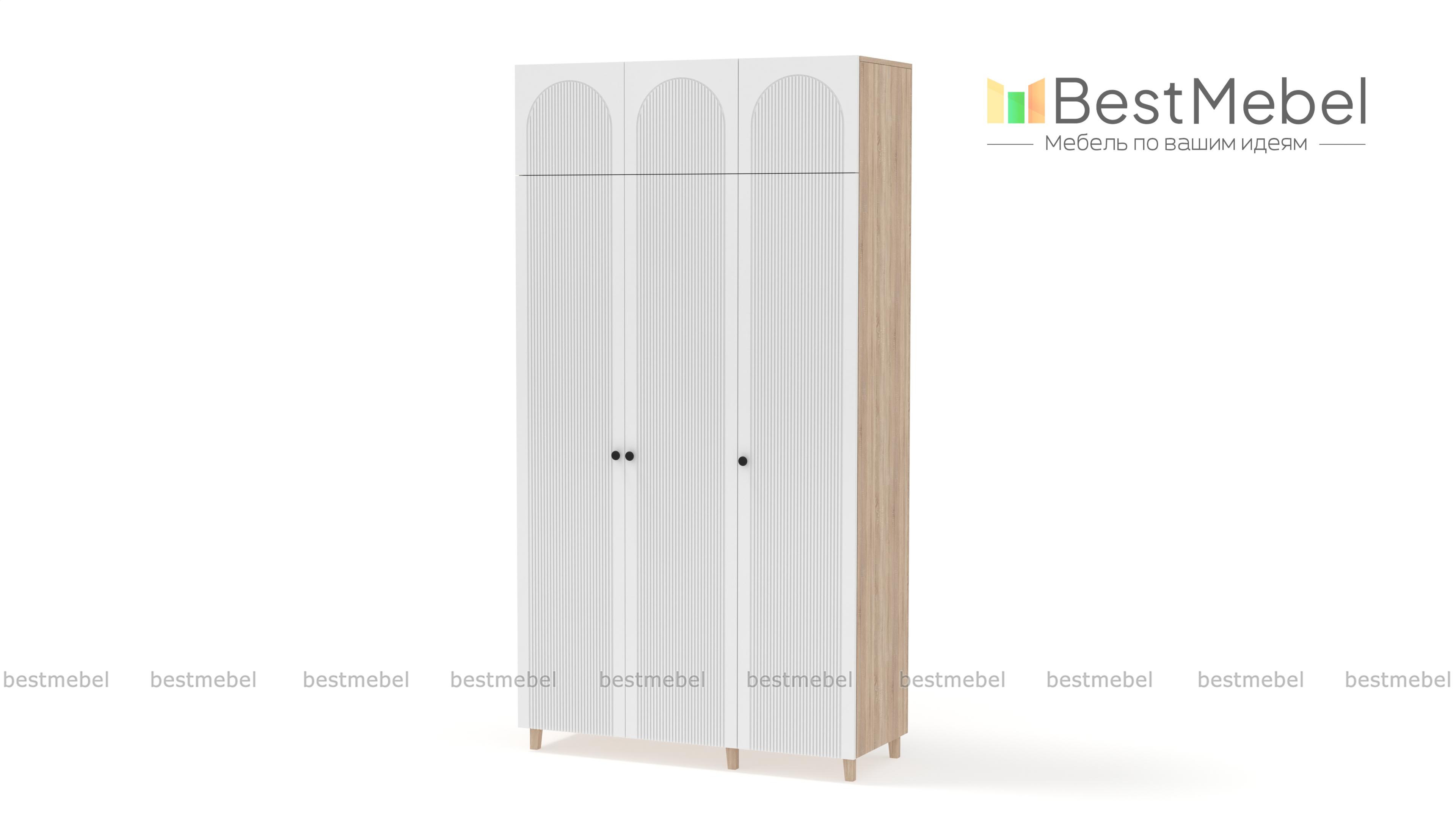 Шкаф распашной Рене 25 BMS сделает хранение в спальне, детской или прихожей удобным и эстетичным. Все предметы гардероба и постельные принадлежности будут скрыты за изящным фасадом с арочными вырезами и рельефом. Корпус и фасад выполнены из ламинированной ДСП и МДФ светлого оттенка, а дополнительную легкость высокому трехдверному шкафу с антресолью придают деревянные ножки. Купить шкаф распашной Рене 25 BMS вы всегда сможете в нашем интернет-магазине, по желанию изменив цвет и размеры.