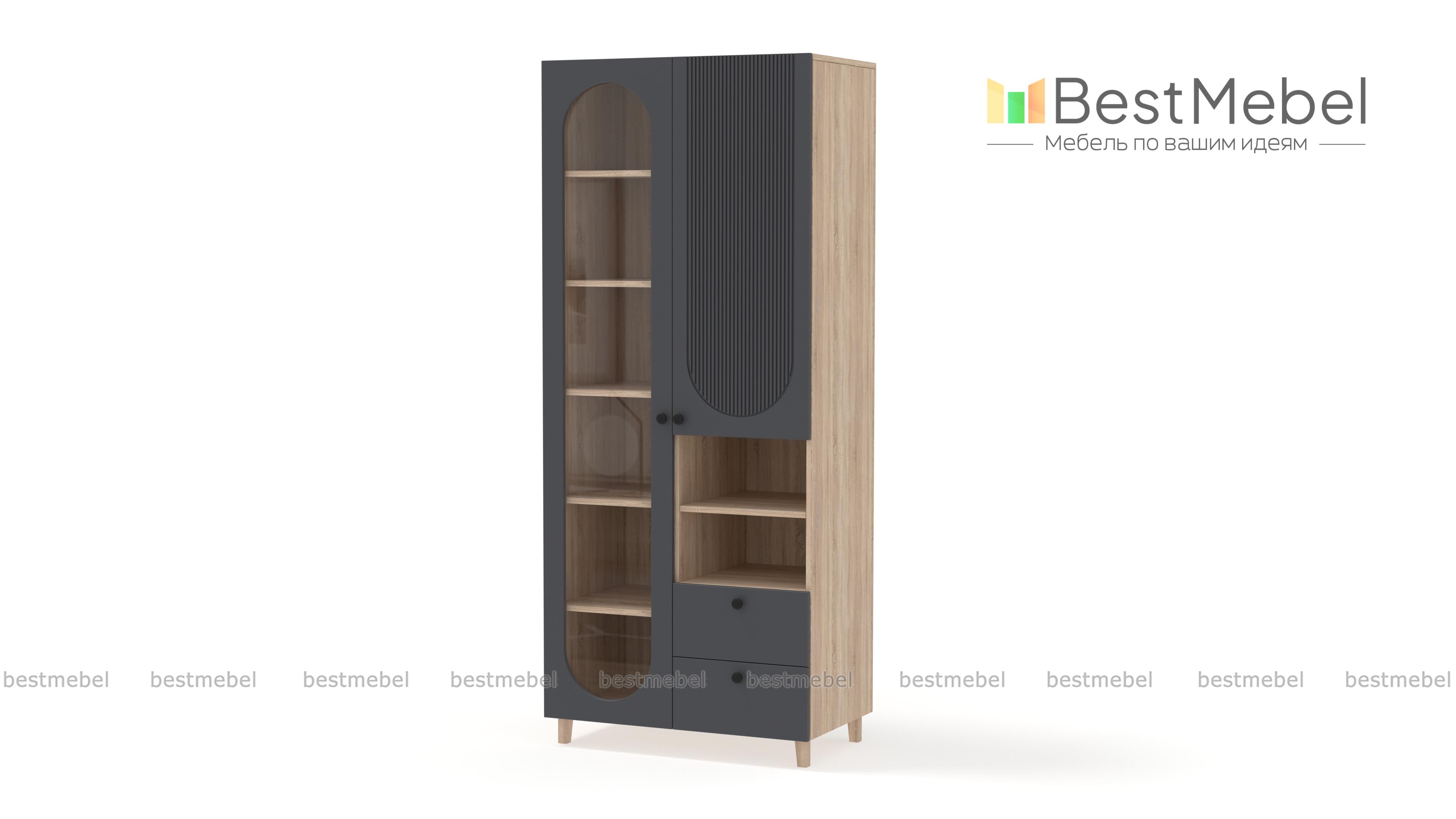 Шкаф распашной Рене 6 BMS с фактурным фасадом органично вписывается в пространство современной квартиры. Лаконичный силуэт с высокими ножками сочетается с оригинальным геометричным декором. Овальный вырез витрины слева дополняет закрытое отделение справа, секция с полкой для открытого хранения и два вместительных выдвижных ящика под мелкие вещи. Купить шкаф распашной Рене 6 BMS вы сможете в нашем интернет-магазине, подобрав размеры, цвет и фурнитуру.