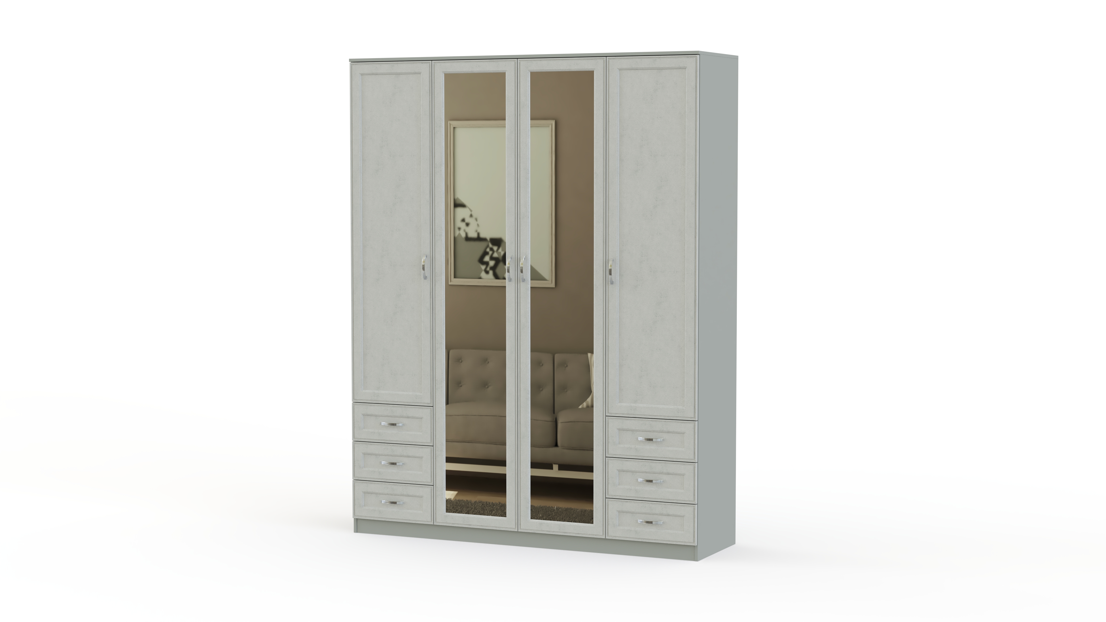 Элегантный в своей простоте, классический комплект для спальни в традиционном стиле. Гарнитур Габриэлла BMS состоит из двуспальной кровати с тумбами, вместительного комбинированного шкафа с зеркалами и комода с навесным зеркалом. Спальня выполнена из качественных материалов в светлых тонах и декорирована по фасаду планками. Спинка кровати отделана мягким контрастным кожзамом, простеганным ромбами, дополняет стильный образ неброская изящная фурнитура.