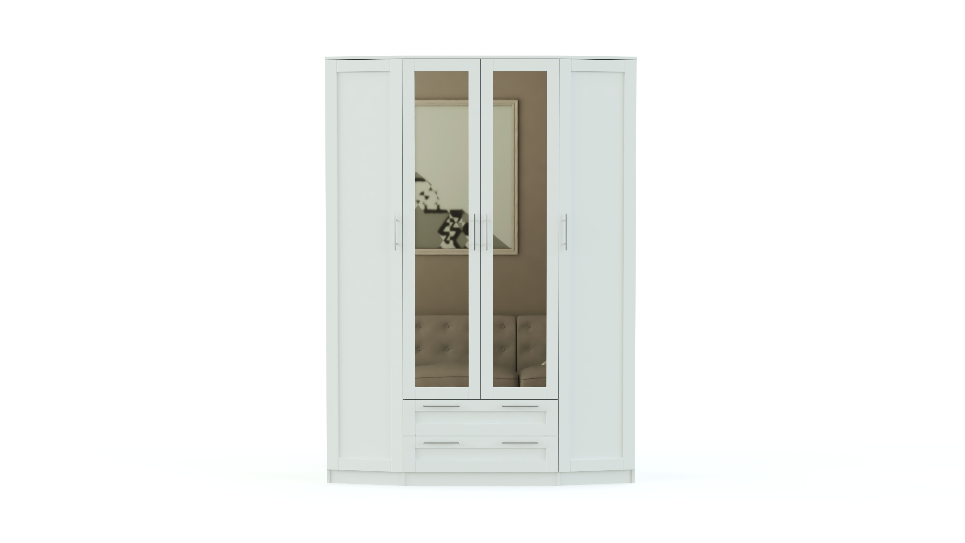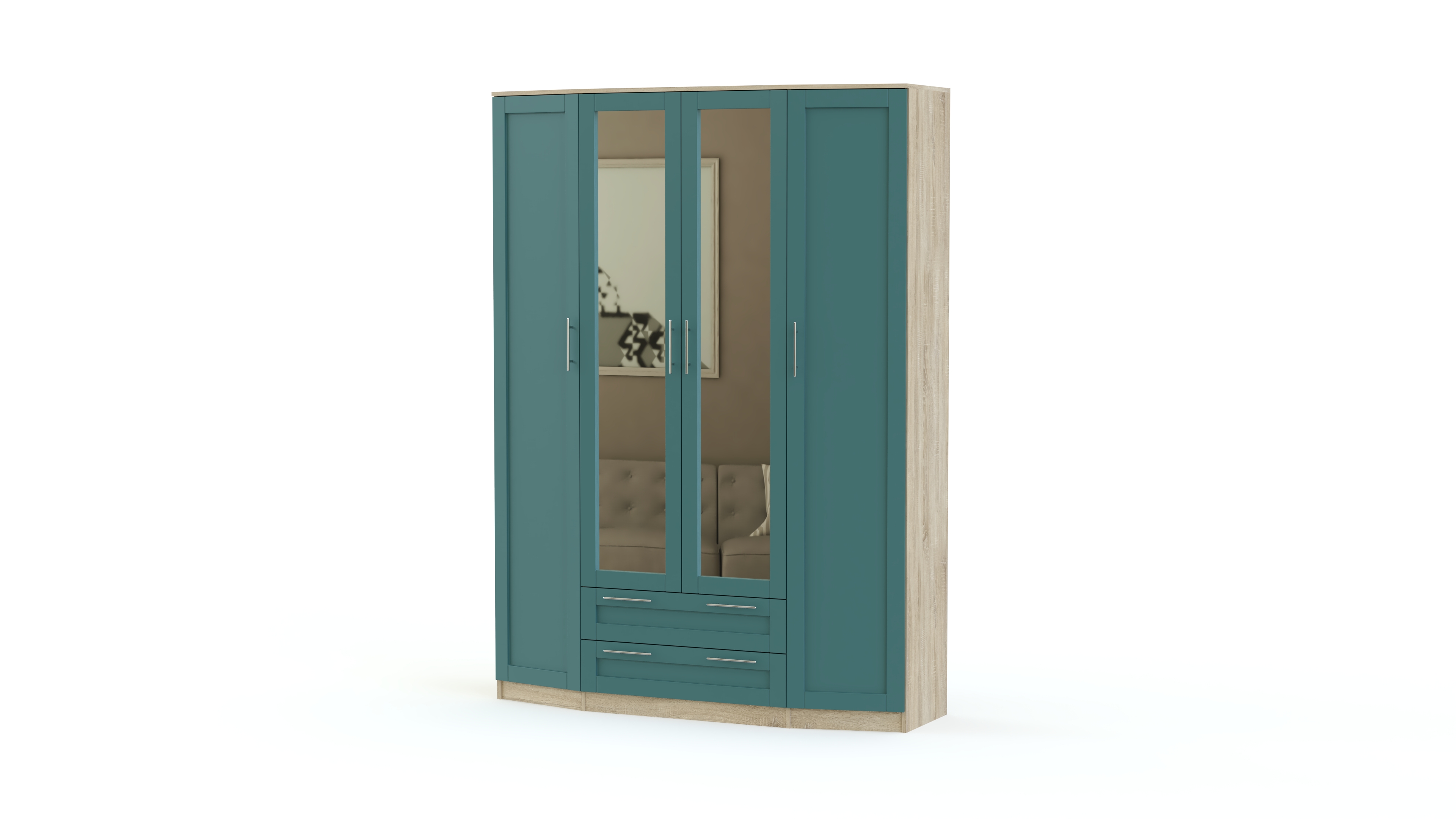 Стильная спальня Скандинавия BMS будет одинаково хорошо смотреться в современном помещении и комнате классического стиля. В ее оформлении удачно сочетаются простые формы, функциональность и интересный декор фасадов естественных древесных оттенков. В комплект входит состоящий из центрального с зеркалами и двух боковых скошенных элементов вместительный шкаф, удобный комод с навесным зеркалом, двуспальная кровать и две тумбы. Особенно выгодной покупка этого гарнитура будет в нашем интернет – магазине.