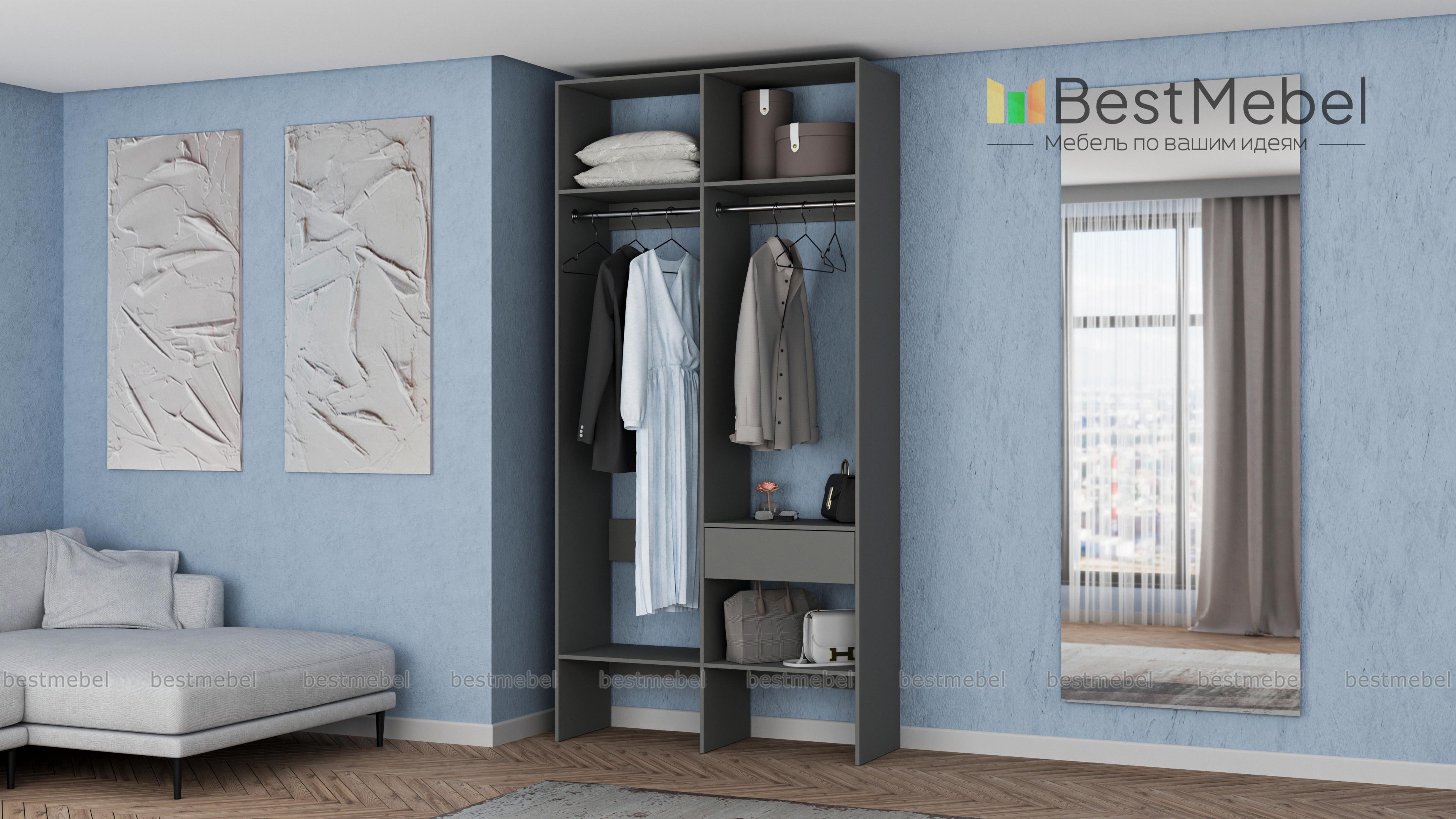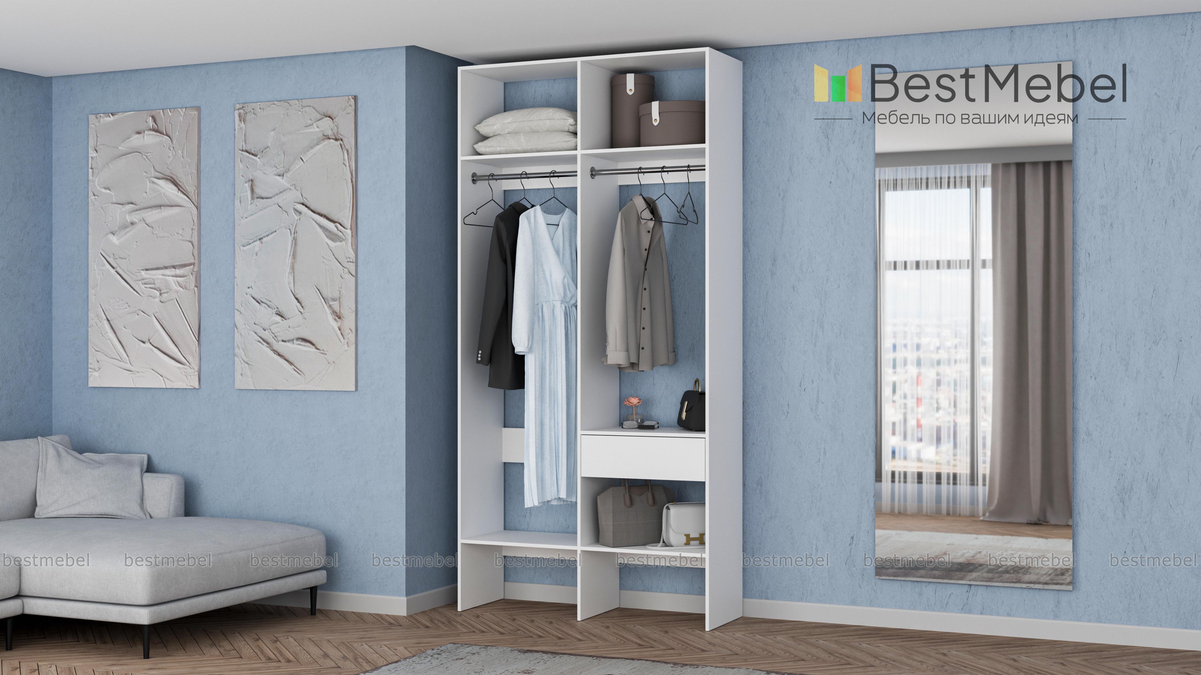 Стеллаж для одежды Мирта 42 BMS для гардеробной или прихожей выполнен в нейтральном светлом оттенке из ламинированной ДСП. Компактная и легкая двухсекционная конструкция объединила два платяных отделения разной высоты, верхние и нижние полки, а также выдвижной ящик, предназначенный для мелочей. В открытом стеллаже будут всегда на виду ваша повседневная одежда и обувь. Купить стеллаж для одежды Мирта 42 BMS вы сможете в нашем интернет-магазине, самостоятельно подобрав размеры и цвет.