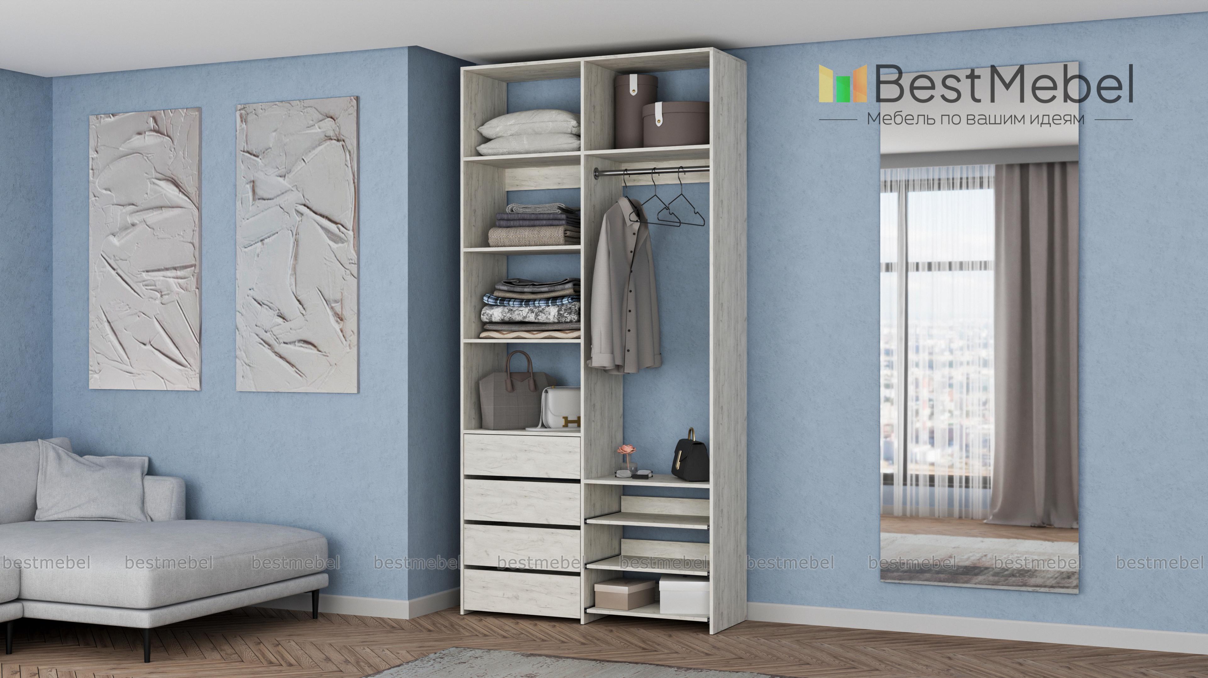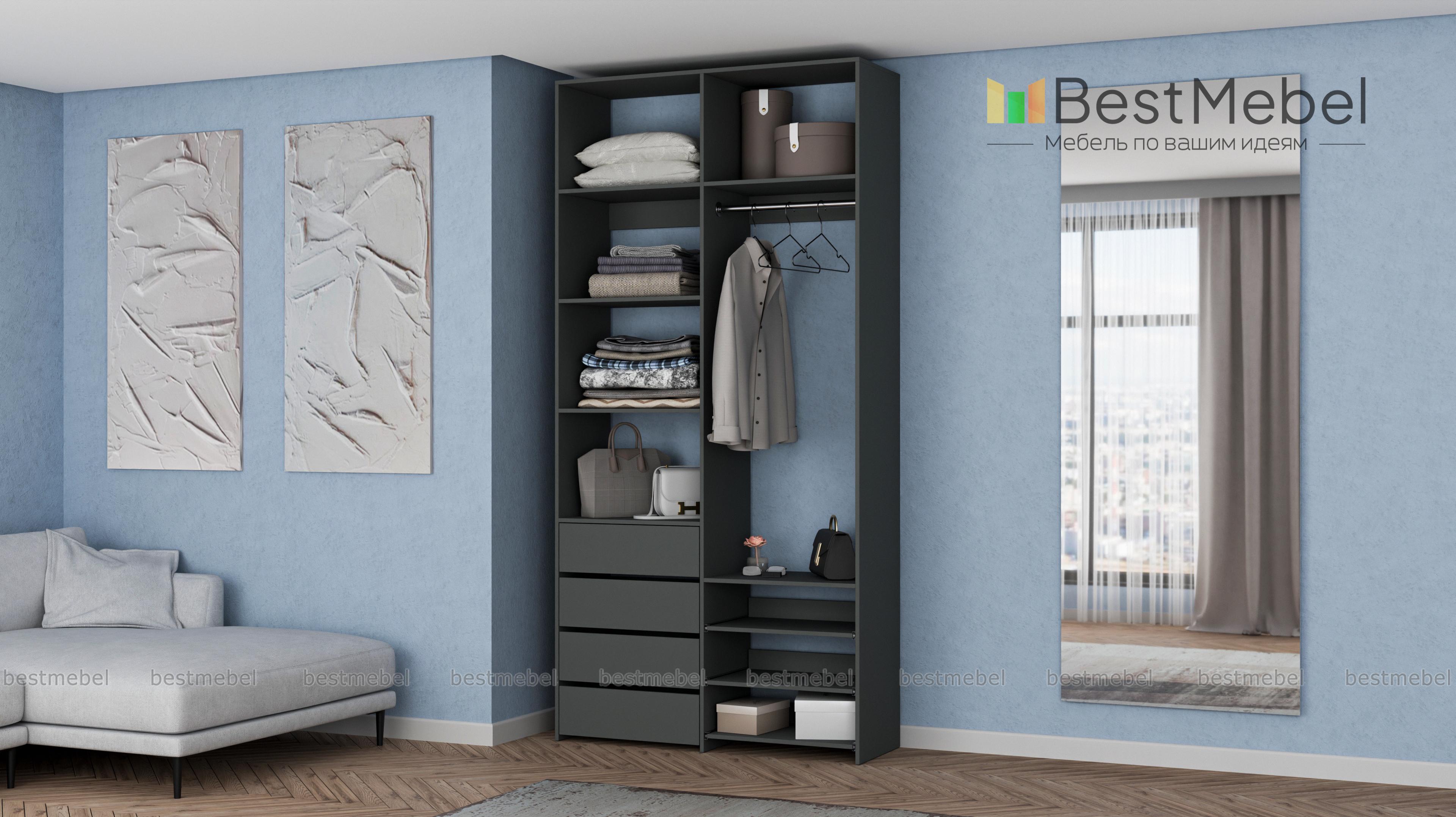 Стеллаж для одежды Мирта 87 BMS оптимален для небольших пространств. Штанга, выдвижные полки и ящики, а также пять просторных бельевых секций обеспечивают достаточно места для хранения базового гардероба. Простой и функциональный дизайн в сочетании с широкой цветовой гаммой позволяют легко комбинировать стеллаж с другой мебелью. Купить стеллаж для одежды Мирта 87 BMS с изготовлением по индивидуальным размерам вы сможете недорого в нашем интернет-магазине.
