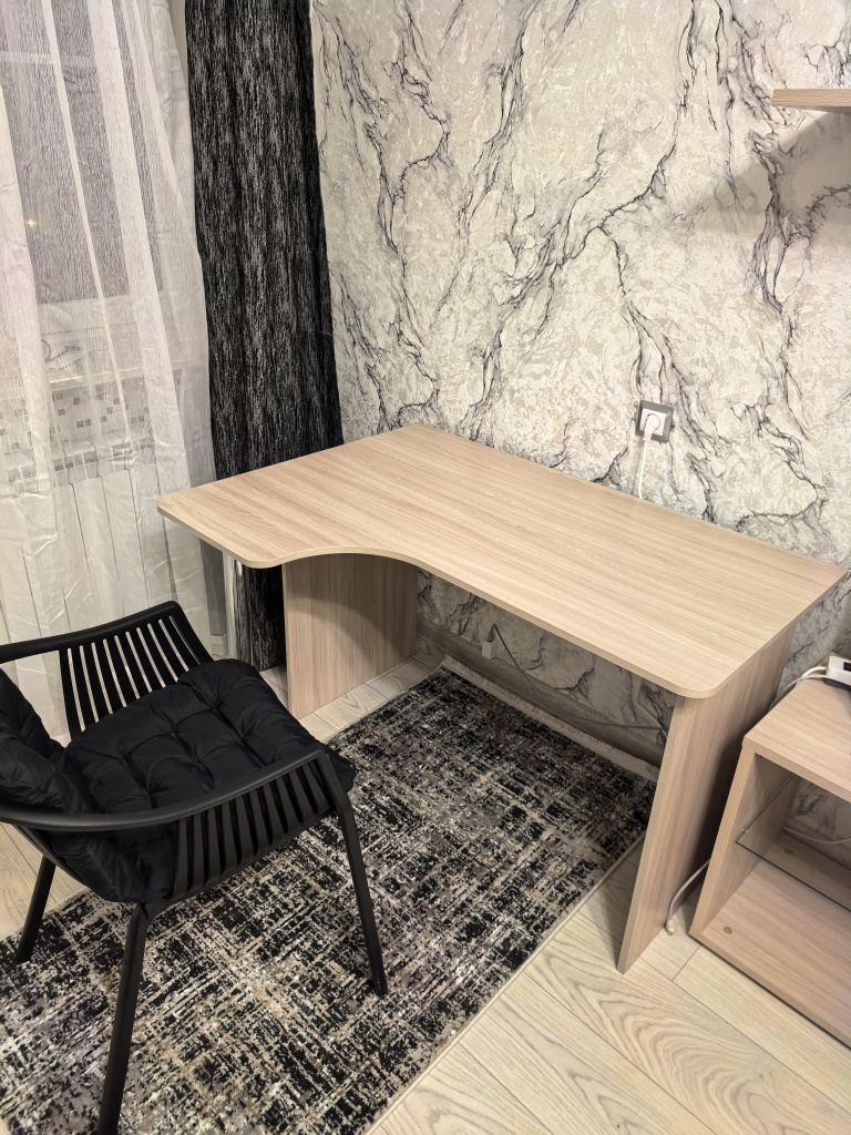 Стол очень красивый, удобный и вместительный.Заказывал нестандартные размеры - все вырезали как надо(на фото - Ш x Г x В - 1350мм x 950мм x 750мм, глубина от "выреза для пуза" до противолежащего угла - 873мм).Неспешная сборка заняла 15 минут. Все было аккуратно упаковано. Инструкция по сборке весьма минималистична, но все итак интуитивно понятно, все намечено-насверлено.По покрытию - цвет "Бетон пайн экзотик" хоть и очень красивый, но сильно отличается от превью на сайте - на сайте он намного темнее. Само покрытие рельефное, тактильно приятное.Кромка - вот тут я что-то ступил и взял стандартную кромку - 0.4мм. Советую все же заказать побольше - уж больно "острые" края стола, как будто порезаться можно, для себя решил эту проблему за 5 минут шкуркой P800.Итого - хороший стол, удобное рабочее место.