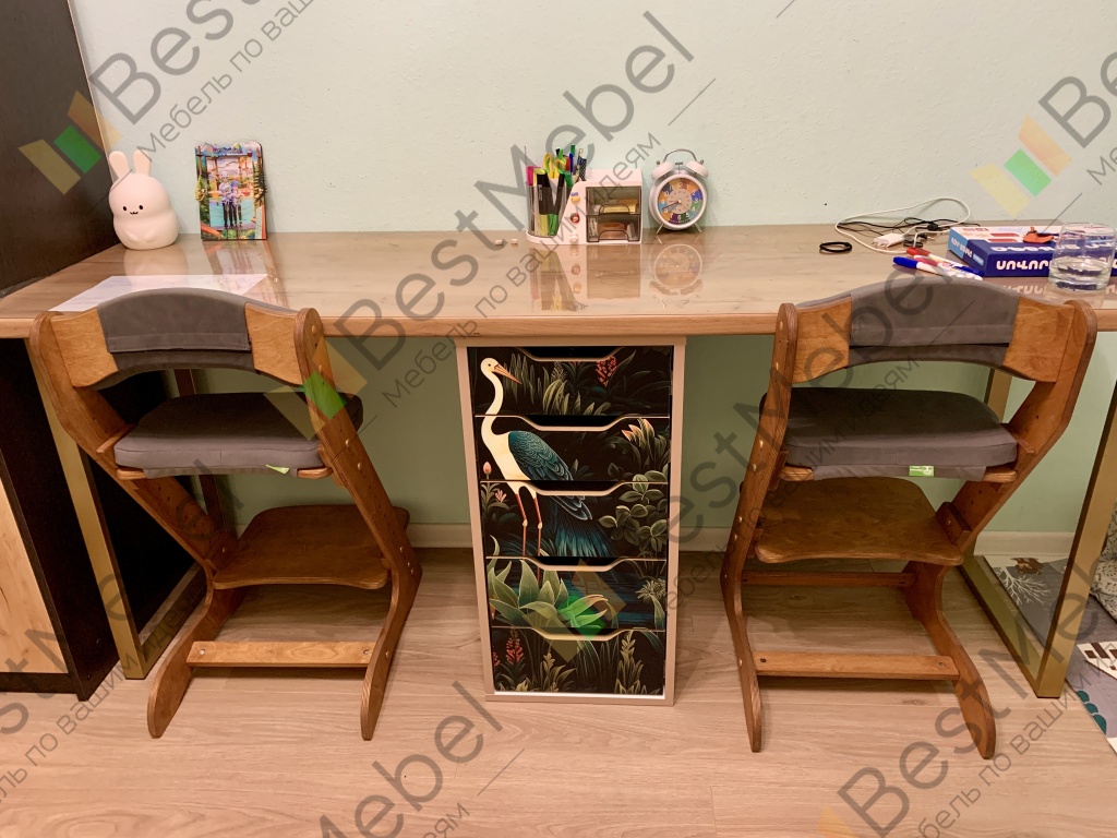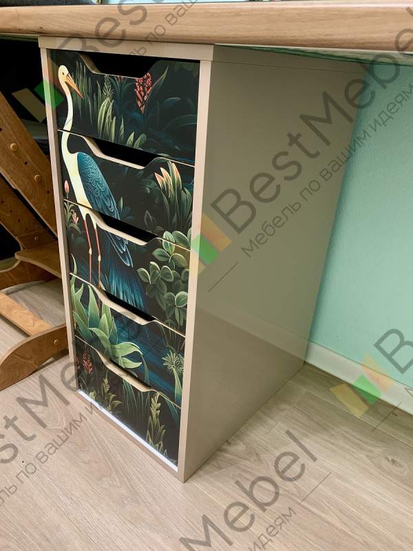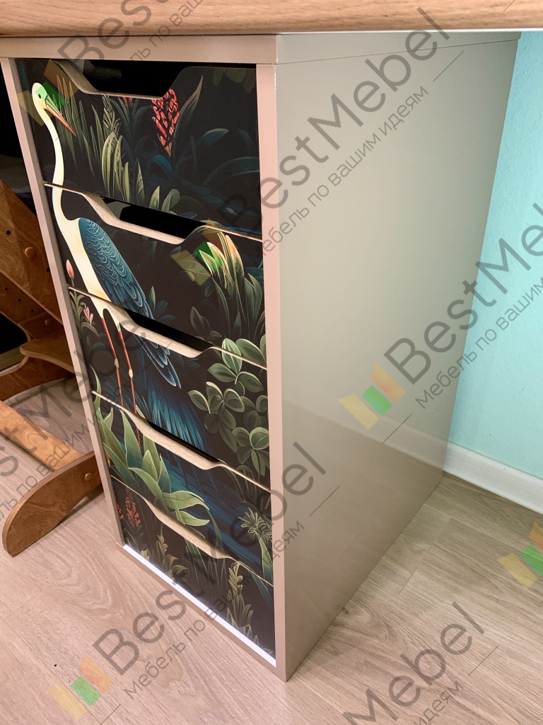в этом заказе всё индивидуально: глянцевый корпус, в т.ч. задняя стенка, скрытые крепежи, шариковые направляющие с доводчиком, фотопечать, материал мдф. Получилось мощно! Мы довольны. Выполняет функцию разделителя под детским столом.