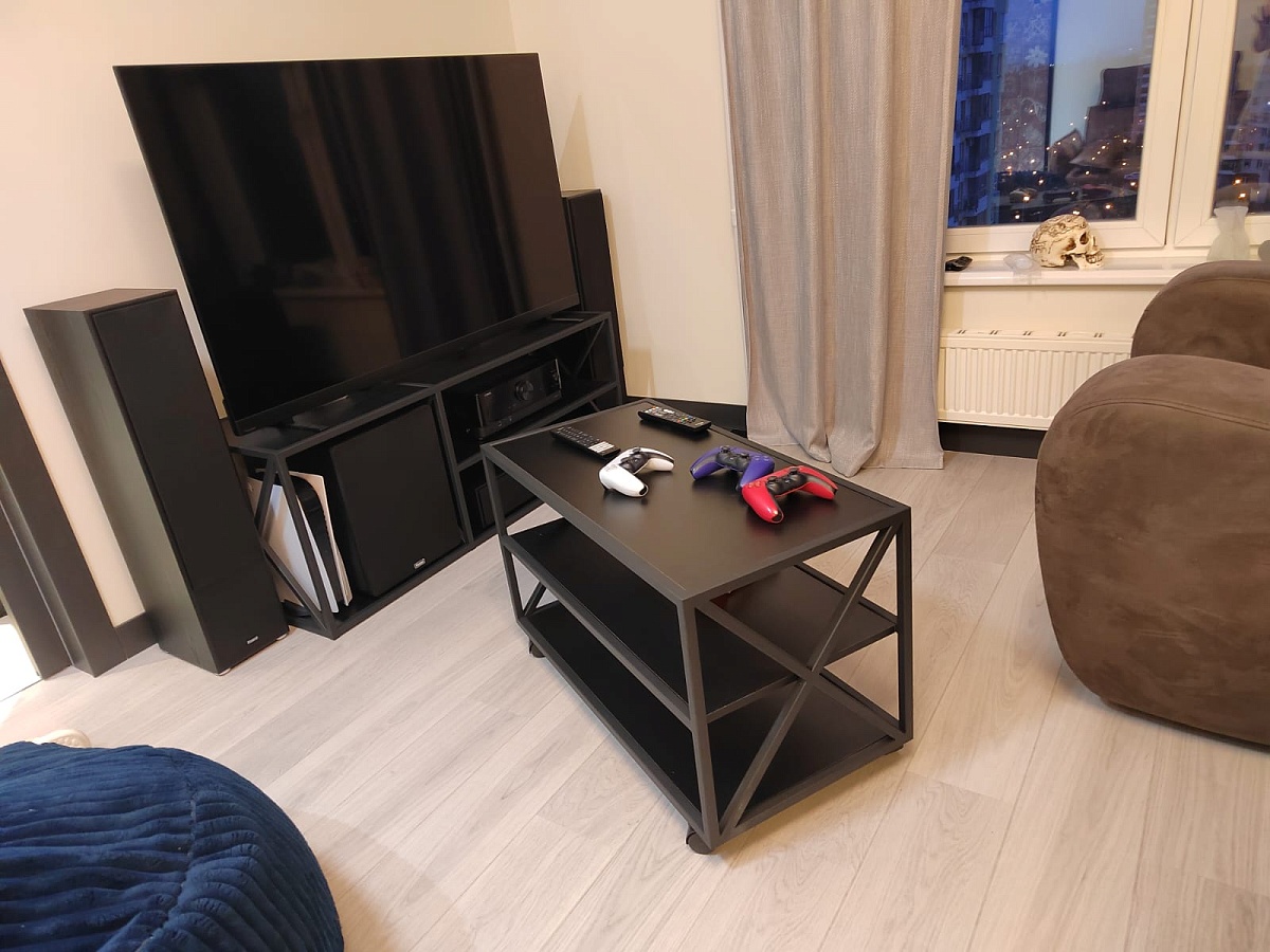 Сделали очень быстро (меньше недели) и качественно под наши размеры (чтобы влезли и плойка и сабвуфер), также столик на колесах.