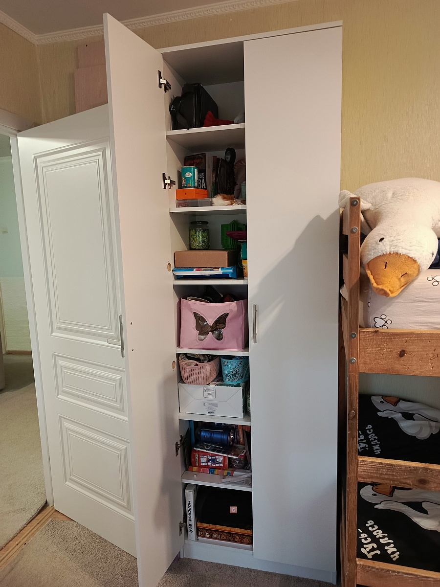Заказ 00000858508Шкаф муж собрал сам, достаточно быстро ))Мы заказали в белом цвете, увеличили ширину и немного убрали глубину. Ещё добавили одну полочку, чтоб больше всего уместилось )Влезло пол детской в этот шкаф, я очень довольна )
