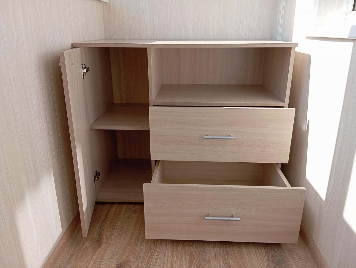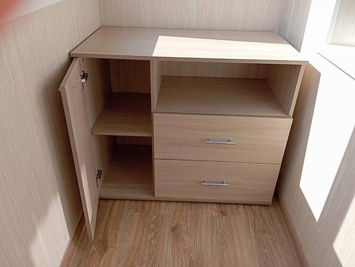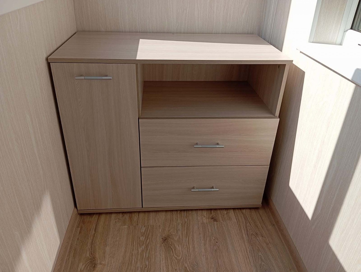 Заказ №891627 от 05.10.2023. Комод заказала на лоджию, куда он отлично вписался. Размеры индивидуальные. Понравился многофункциональностью - есть и ящики выдвижные, и шкафчик с закрытыми полками, и полка открытая. Очень удобно, результатом довольна, рекомендую. Цвет Ясень Шимо Светлый. 00000522966   Комод Нова B1 BMS (940х800х500)