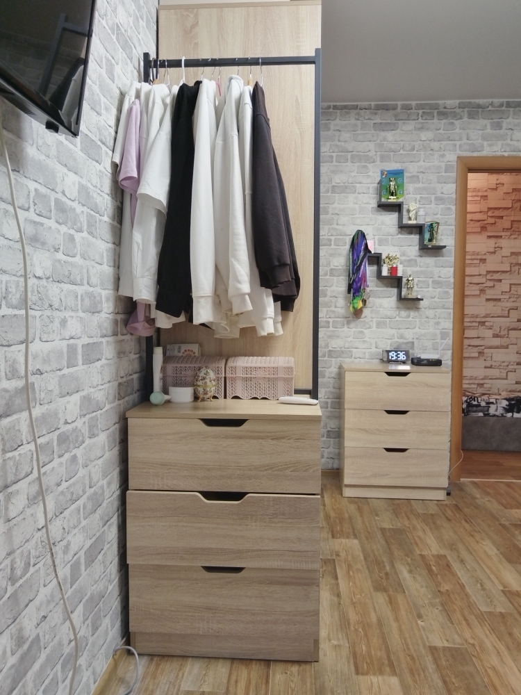 Очень стильный комод. Появилось дополнительное место для хранения одежды на штанге. Отлично вписался в интерьер. Спасибо
