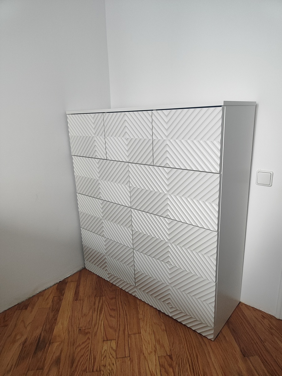 Собрали комод, который сами для себя придумали на основе имеющихся образцов с 9-ю выдвижными ящиками. Фасады с фрезеровкой выполнены и подогнаны очень хорошо. Рисунок был сложный, но все совпало и получилось очень красиво. Отдельное спасибо за нижнюю планку фасада на цоколь- получился единый рисунок и современный внешний вид. Есть замечания по глубине ящиков, т.к. в собранном виде ящики не доходят до задней стенке на 6 см. Как-то этот момент не согласовали. Думаю, сто можно было на 5 см точно увеличить глубину ящиков, что было бы функциональнее, т.к. комод это не только фасад, но и шкаф для вещей, постельного белья и Эти 5см я учитывала при выборе размера комода. Если проблема в фурнитуре, то можно было это обсудить. А так, нам теперь с этим жить. Ещё сборка тоже в некоторых местах не продумана ( центральные внутренние отверстия под симметричные направляющие почему-то одно сквозное. Получается, что направляющие с одной стороны прикрутили, а потом с другой стороны центральной стойки в те же отверстия нужно прикручивать с другой стороны направляющие. Шурупы ломаются друг о друга и конструкция кривая. Пришлось подгонять самим. Не хватило 2-х больших шурупов для сборки корпуса. Думаю, что лучше больше класть, чем меньше. Это уже 2-й наш большой заказ. В любом случае большое спасибо, что Вы воплощает наши мечты! Отдельное огромное спасибо инженеру-конструктору и мастеру по внешнему виду фрезеровки. Получилось ОГОНЬ!