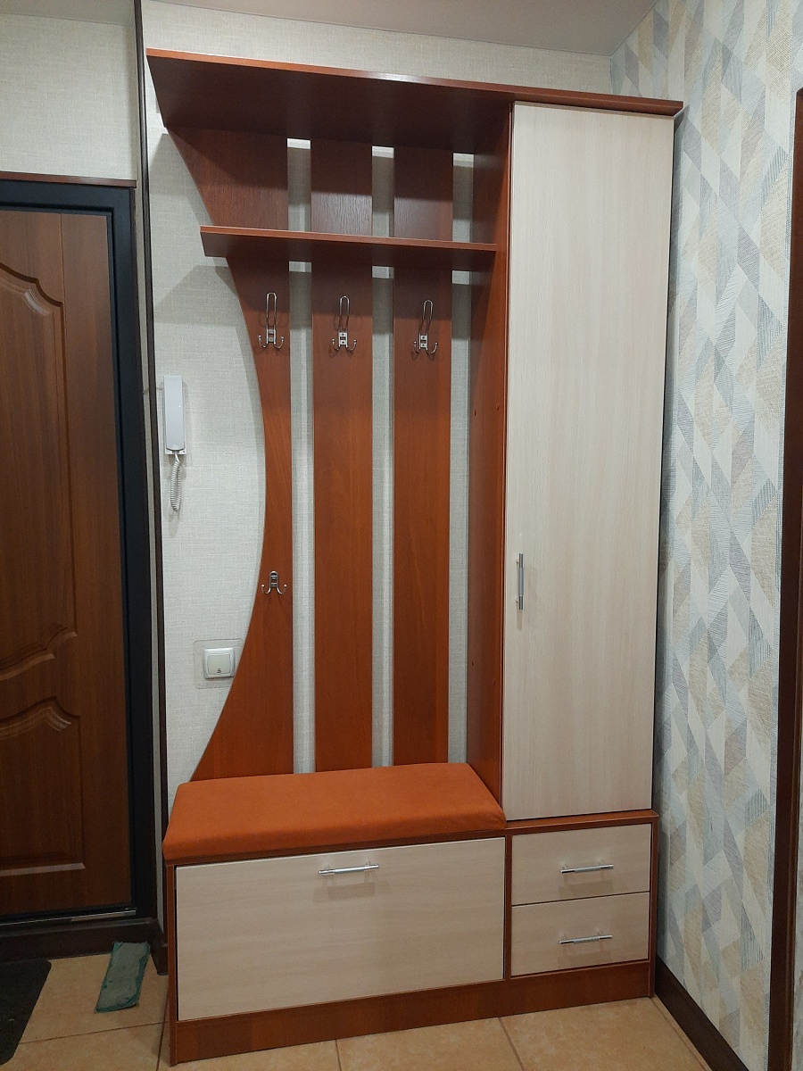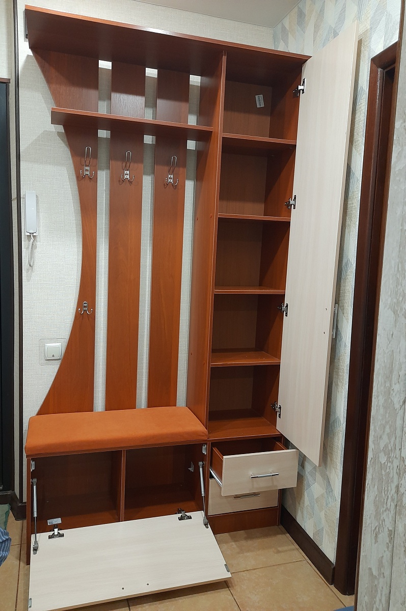 Прихожая отличная, всё устраивает. Внесли все мои пожелания и дополнения при изготовлении. Обошлась в 23.400 + подъём + 13% собиралась вертикально,т.к. места мало было.