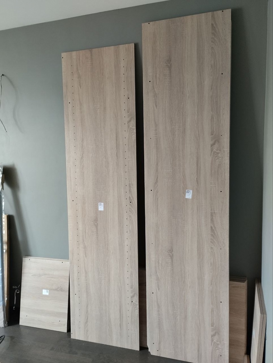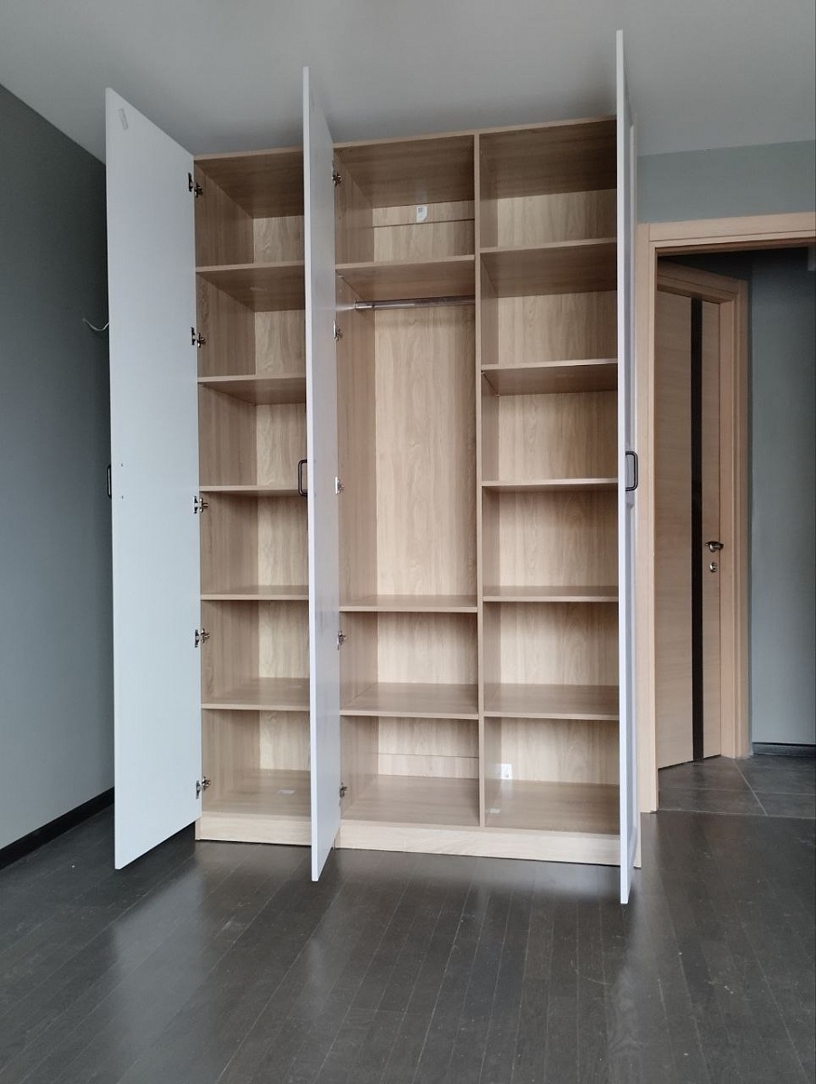 Шкаф хорошего качества, прочный. дефектов не обнаружено. Доставили вовремя в полной комплектации. Заказывали модель в стандартных размерах, выбрали с полками и отделением со штангой . Шкаф состоит из двух отдельных шкафов: двустворчатой секции и одностворчатой. Они потом свинчиваются между собой. Отверстий для соединения не было (просверлили самостоятельно). Таким образом,секции можно поставить в разных местах - это удобно, если захочется переставить мебель))! Так как собирали самостоятельно, возникли трудности с отсутствием инструкции - ее нет! Есть только схема с номерами деталей и таблица. Все элементы пронумерованы. Метизы упакованы в пакете все вместе. В принципе, разобраться можно, если есть опыт сборки мебели. Хоть шкаф и называется "Пакс", но родная икеевская инструкция  не подходит, другие способы крепления. Результатом и качеством остались довольны(Заказ 00000637096, изделие ЭСКИЗ Шкаф распашной Пакс Гримо Pax Grimo 5 (1500х2360х600) (Белье - Платье - Белье (5 полок) (3))