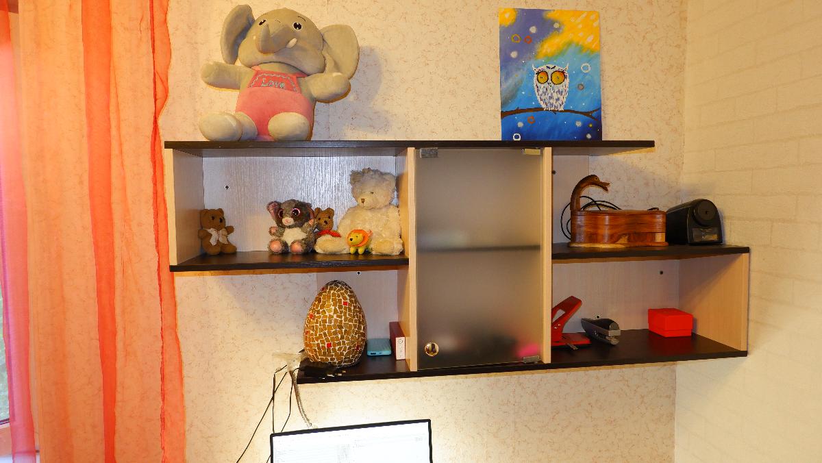 Классный стеллаж. Заказали под длину стола, с матовым стеклом. Смотрится стильно. Молочный дуб и Венге цава - создают отличную цветовую гамму комнаты.
