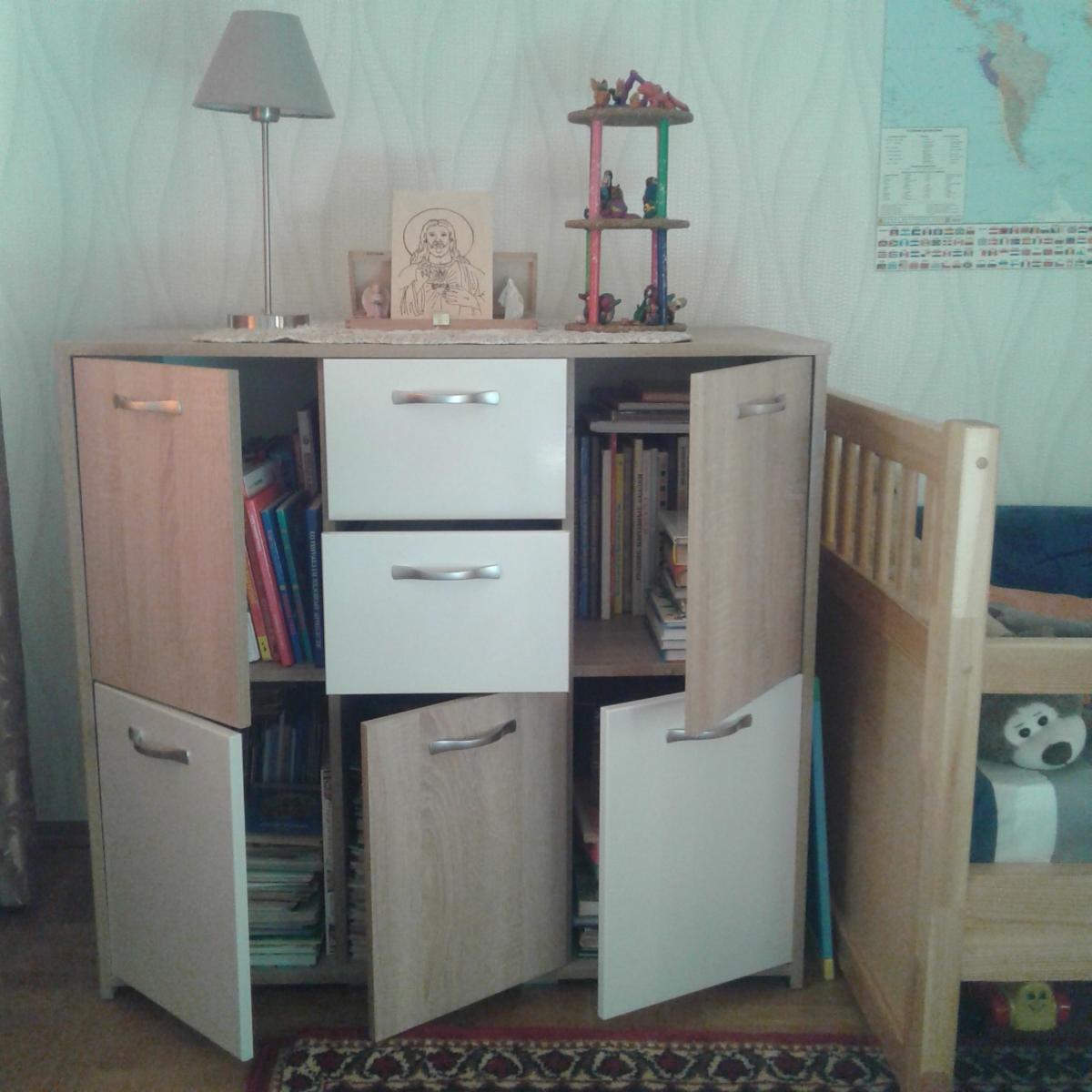 Заказывали комод Элит 8 комод BMS в январе, габариты (1000х920х510), детские книги в зависимости от размера стоят в два ряда. Цвет, по-моему Дуб сонома и белый поблёскивающий, с учётом всех пожеланий вышло 13 тыс. Доставили и сделали всё аккуратно, подняли и собрали мы сами. Спасибо.