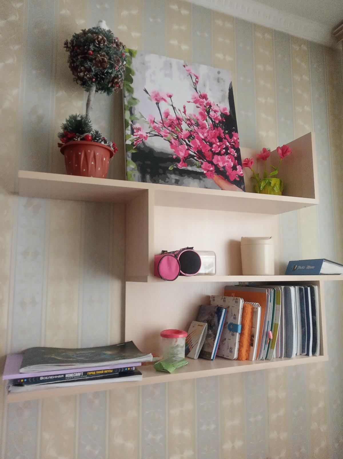Моей радости просто нет предела. Полка досталась в подарок. Она так классно вписалась в интерьер (до этого заказала стол с тумбочкой такой же расцветки). Очень красиво смотрится, можно разместить кучу мелочи. Полка очень необычная и удобная.  (Заказ 00000603352)
