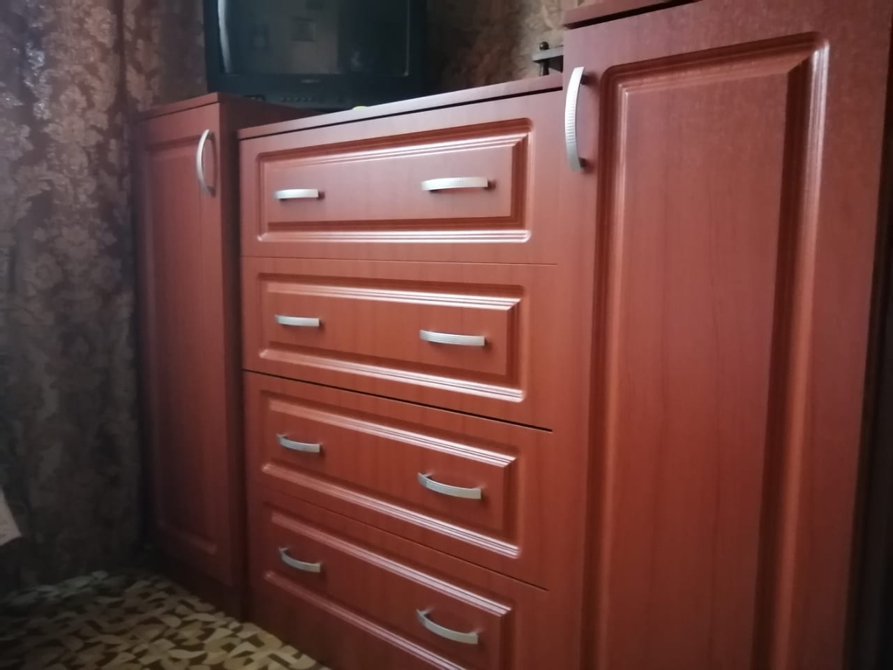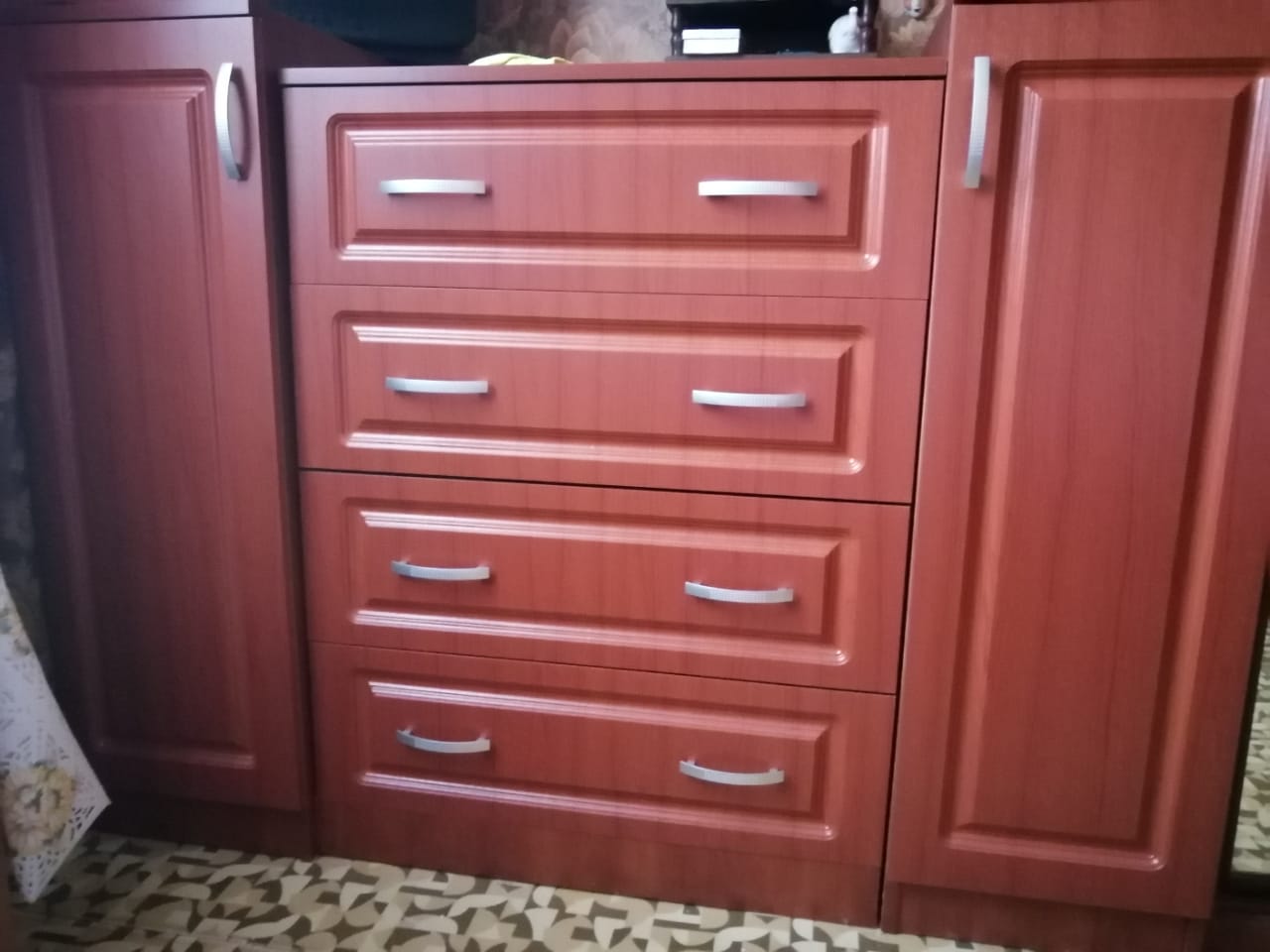 Заказ 352984. Комод заказывали по индивидуальным размерам, так как нужен был очень большой и широкий комод, как продолжение шкафа-купе. Цвет корпуса: Яблоня ЛокарноЦвет фасадов: Вишня 9003.  Комод состоит из 3-х модулей. Боковые модули с полками. Высоту полок можно регулировать. покупкой довольны