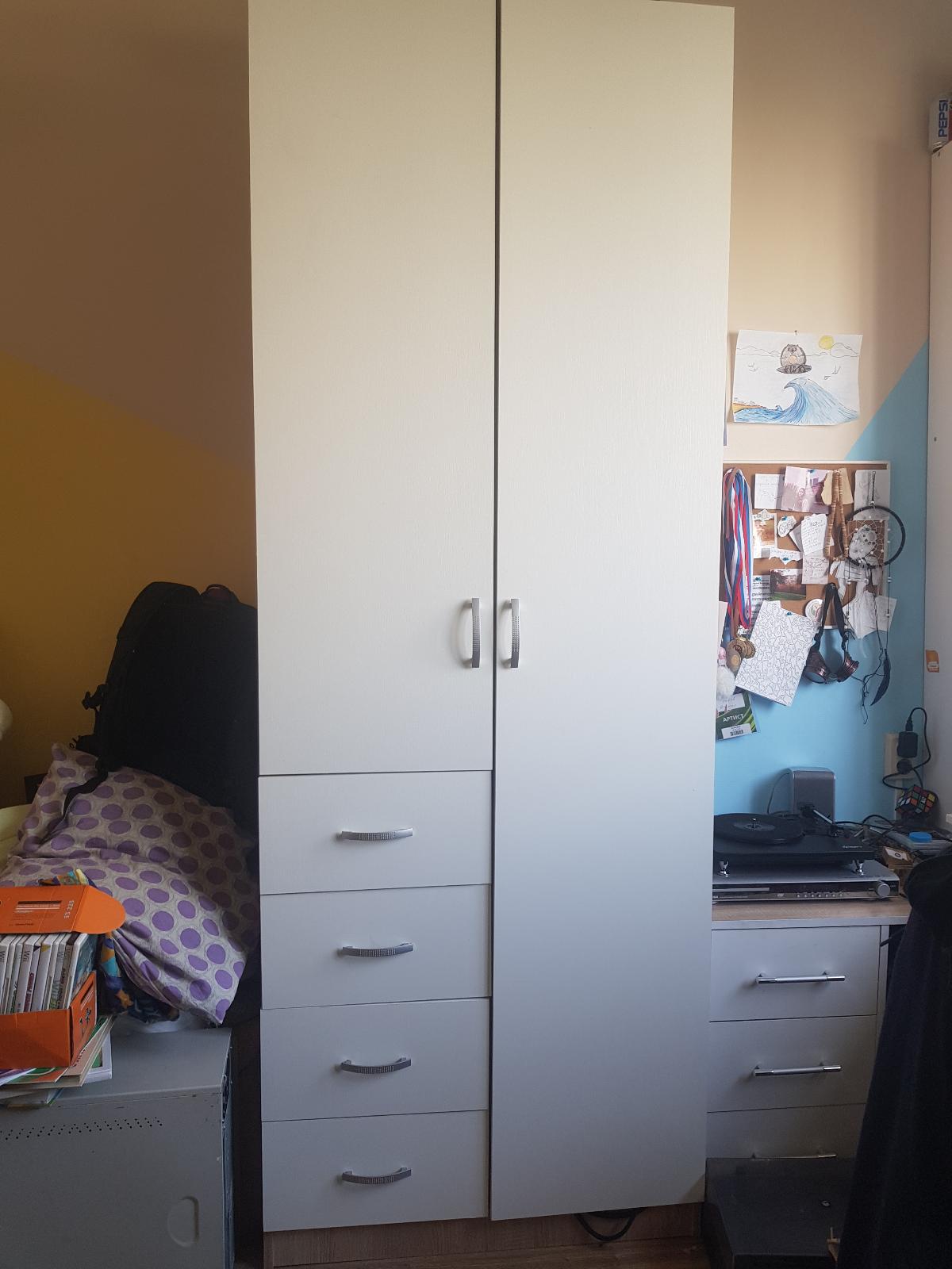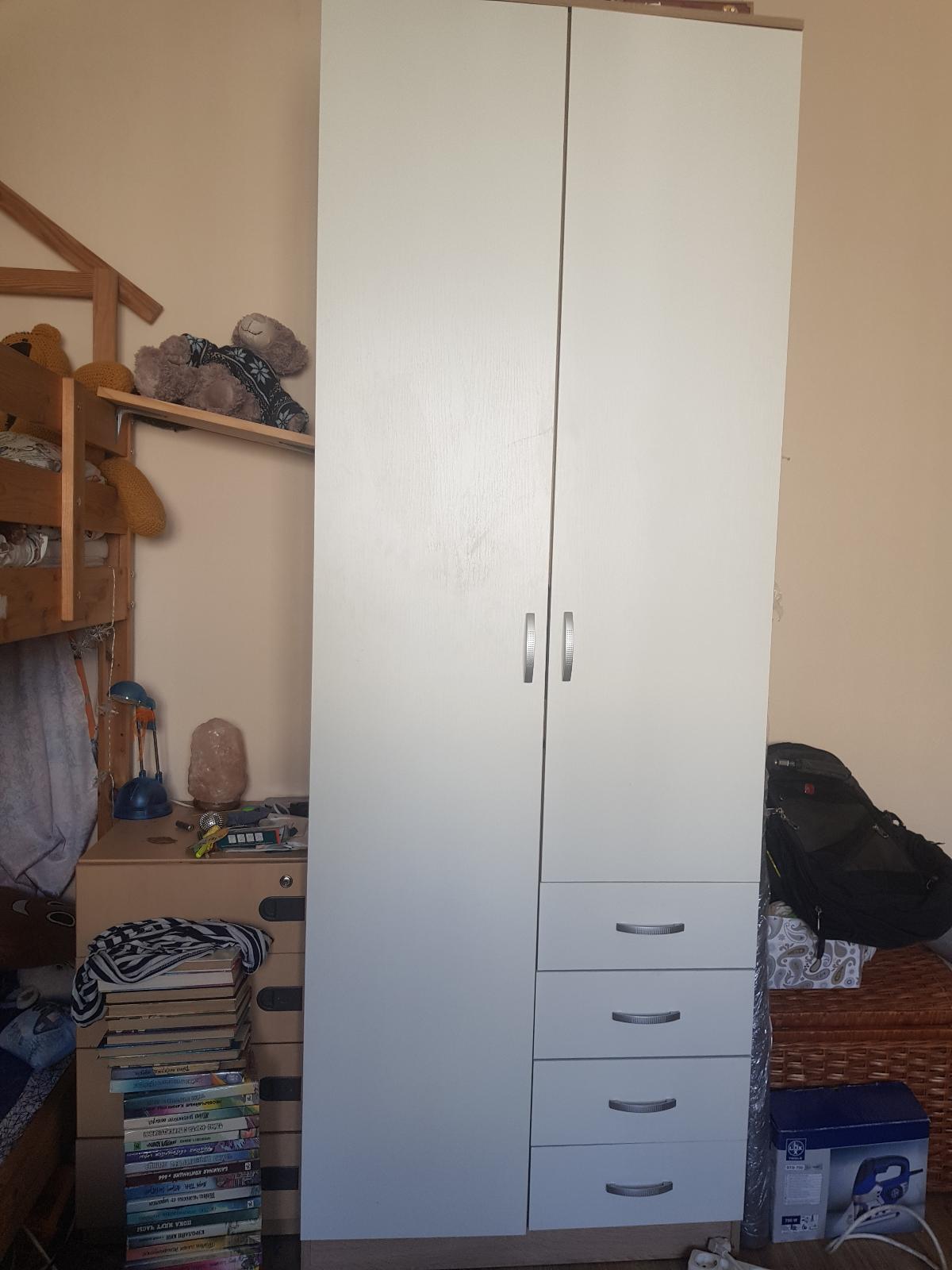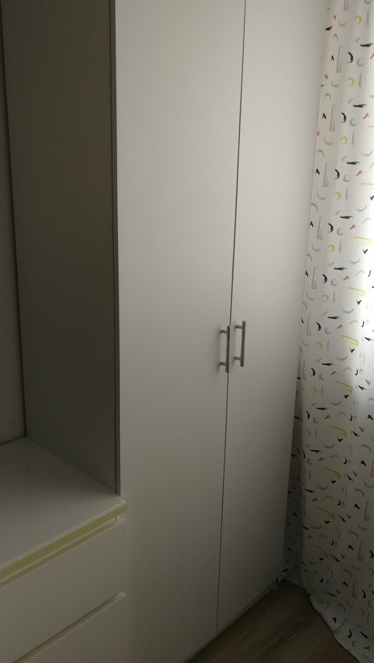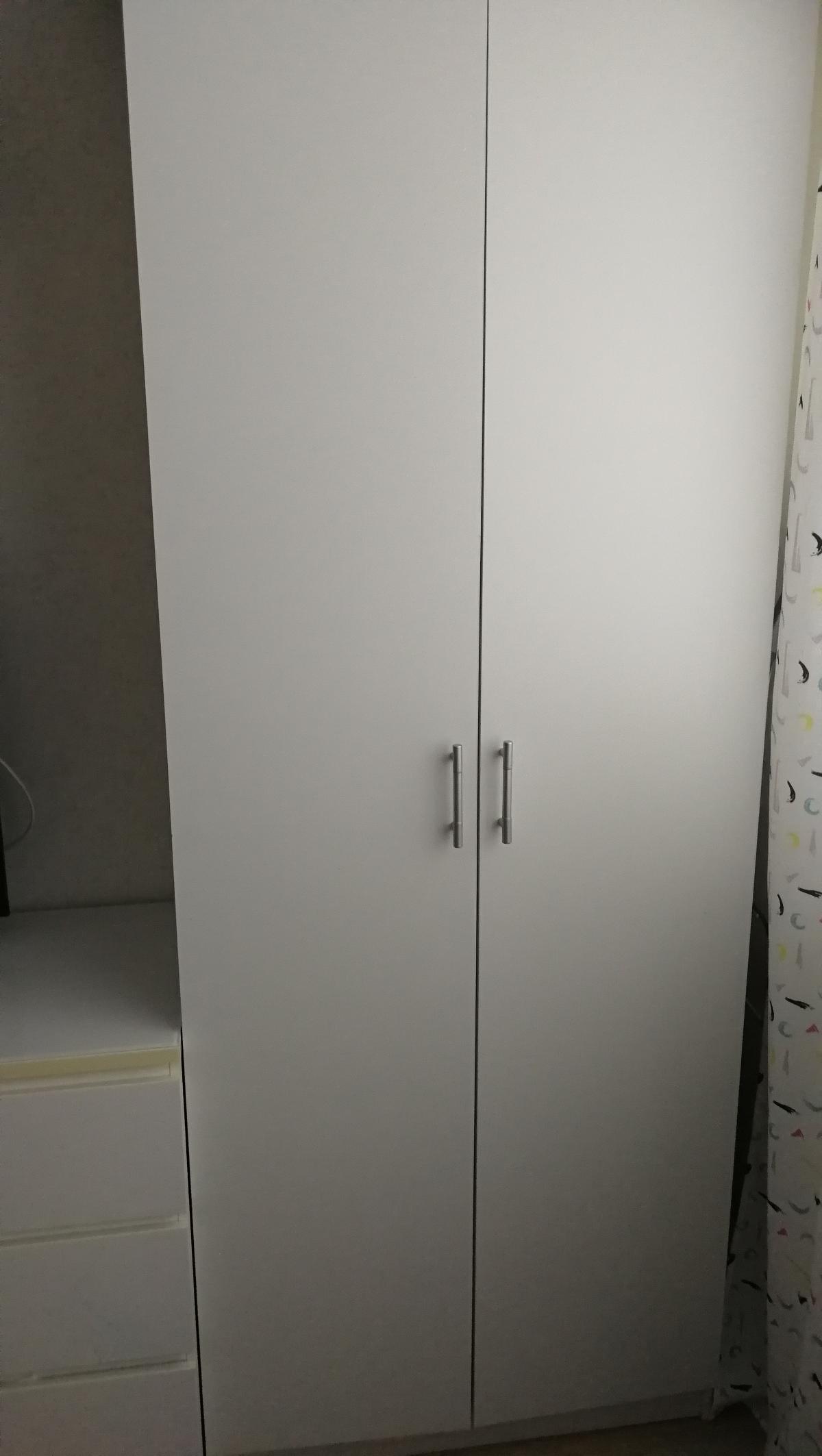 Покупала в карантин два таких шкафа (заказы 291297 и 285464).Понравилось,что сама выбрала цвета шкафа и размер.Доставили быстро и без нареканий.Собирали сами.Не самая моя простая сборка,т.к.очень нечитабельная инструкция,но ничего,справились) .Стандартная фурнитура,конечно,плохая,об этом сразу предупреждали операторы,но брали стандарт,чтобы потом купить такую,какая нам нужна и нравится.