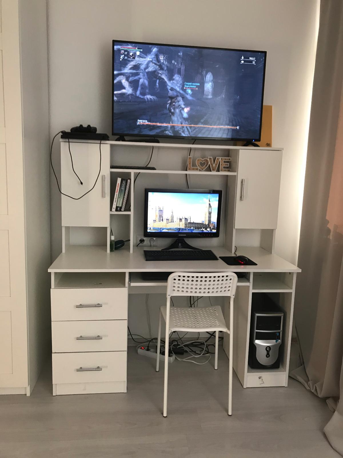 Стол для ПК выбирал долго. Понравилась вариабельность данного заказа по размерам и цвету, удобство, эргономика. Отличный доступ к системному блоку ПК. На столе отлично разместились монитор 24" , ТВ 15", Принтер-сканер-копир НР. Отказался в заказе от выдвижной полки для клавиатуры, стеклянной дверцы на полке и полки для компакт-дисков ( к сожалению на цену заказа это не повлияло...) Собрали самостоятельно, вдвоём за 8 часов. На полках отлично разместились звуковые колонки и усилитель ПК, папки и разные мелочи. Изготовили и привезли удивительно быстро (за неделю)Недостатки: 1. Оплата только наличными; 2. В столешнице в углу желательно делать стандартное отверстие с крышкой для пропуска соединительных проводов ПК, монитора, принтера; 3. Ножки стола на 10-15 мм больше или варианты высоты в заказе ( При высоких плинтусах стол не плотно примыкает к стене) 4. Торцовочная лента столешницы  во "впуклости" из за температурных напряжений через 2 недели начала отклеиваться...Пришлось подклеивать и фиксировать саморезом с пресс-шайбой. На функциональные возможности это не повлияло, но осадочек остался.