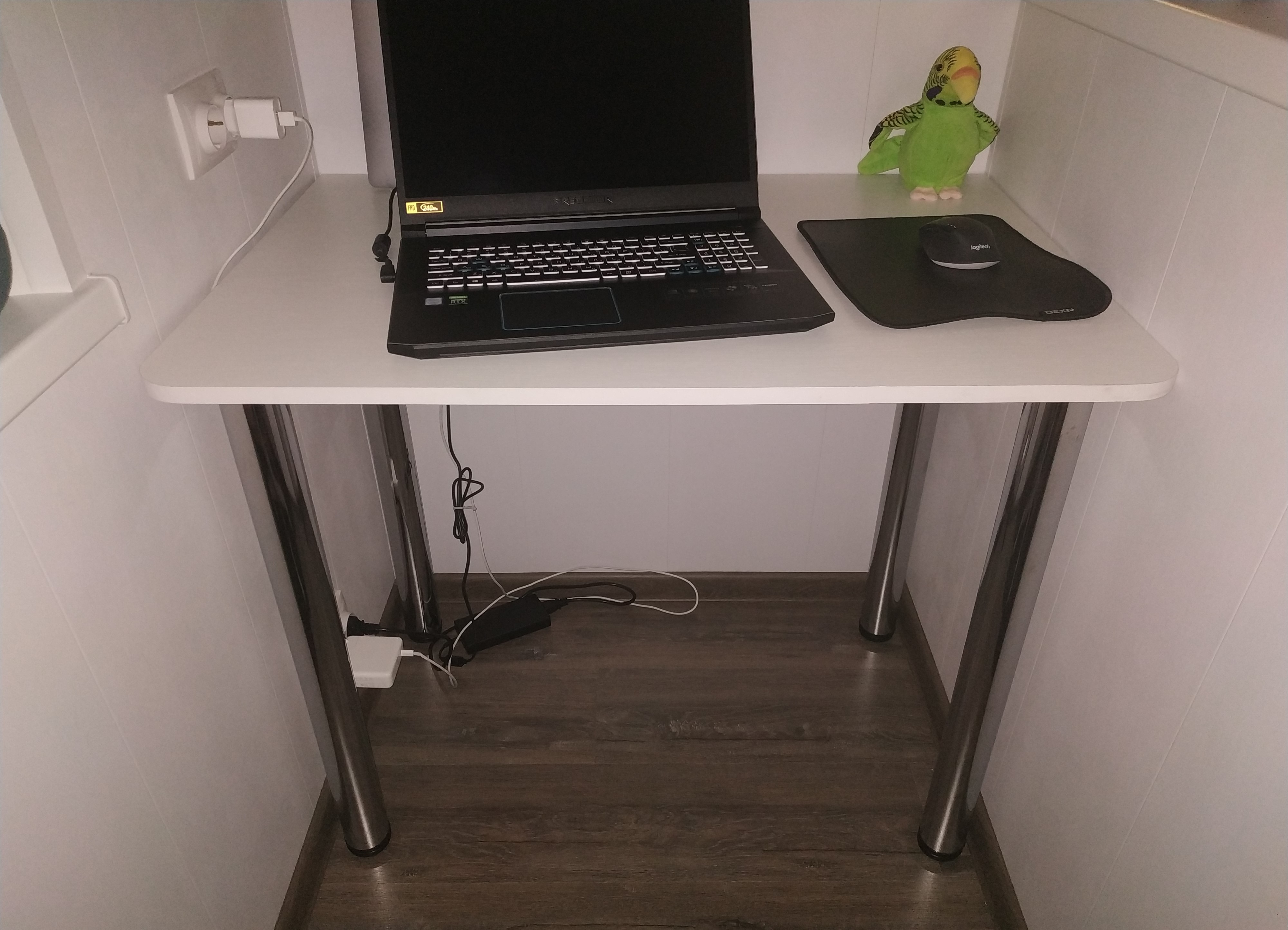 Отличный стол, за такие деньги - просто супер.Брал со стандартными размерами по всем габаритам (ШВГ 90х76х60). Сидеть удобно, даже если закинуть ногу на ногу.Не стал собирать полностью, так как мне это было не нужно, прикрутил только ножки (их в комплекте было 4, что просто прекрасно). По телефону попросил менеджера прорезать дырку для шнуров (см. фото) - сделали бесплатно. Ножки можно отрегулировать по высоте, чтобы стол не шатался даже на неровной поверхности. Единственный недостаток - кромка стола немного режет руки, так как острая, но планирую шлифануть, и проблемы не будет.Короче, все супер, спасибо большое!