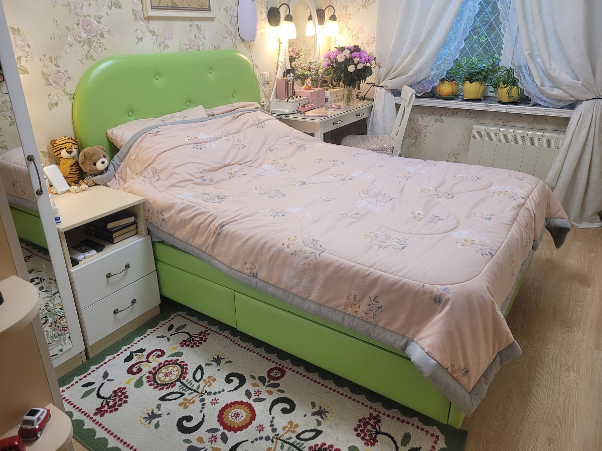 Заказала данную кровать в обивке экокожей Санторини 406, сделали по моим размерам под нестандартный матрас. 4 ящика сделали меня счастливой, утром вставать не хочется с такой кроватки !