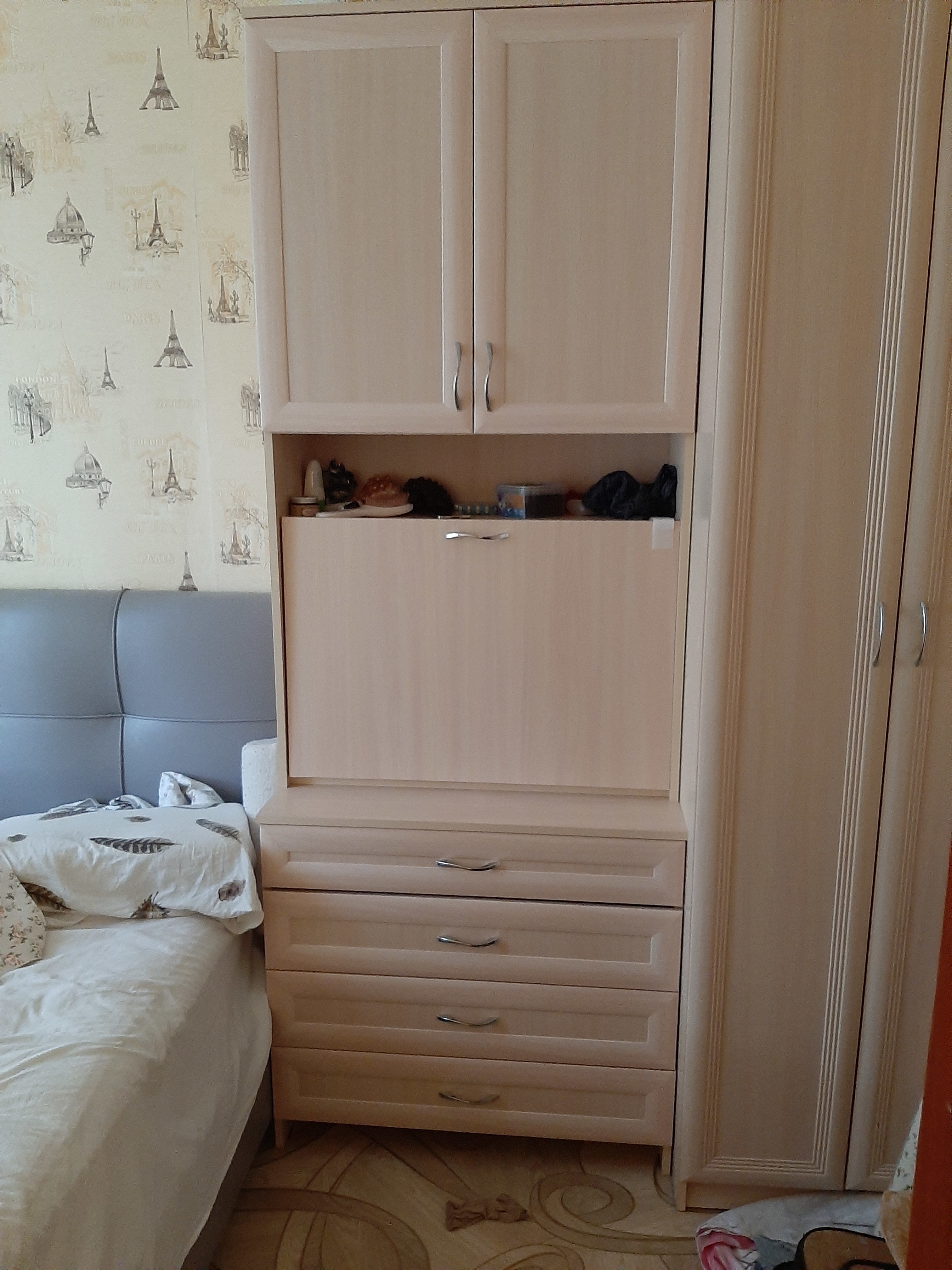 У меня небольшая спальня где я хотела разместить столик для макияжа,комод и шкаф с полками,но все это физически не могло поместиться в моей спальне((И благодаря уникальной Бест мебели я нашла решерие!!У меня теппрь есть откидной столик и комод где я разместила мои вещи да еще и верняя секция для хранения.Там я разместила полотенца и постельное белье.Недорого!!Эргономично!!я очень довольна.